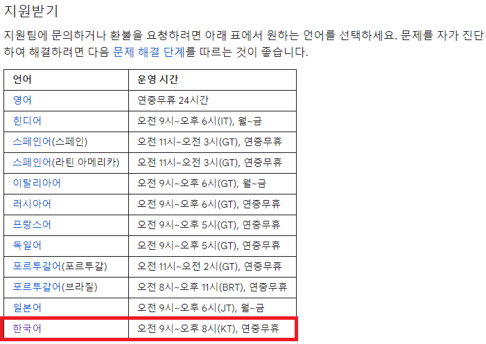 ※ 고객 센터 운영 시간을 꼭 확인해주시고 운영하고 있다면 빨간 박스 좌측에 한국어를 클릭해주시면 단계별로 넘어갈 수 있습니다.