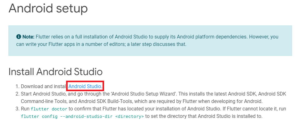 4-1. flutter install 홈페이지에서 아래로 스크롤을 내려보시면 Android setup이란 제목밑에 링크를 클릭해주시면 됩니다.