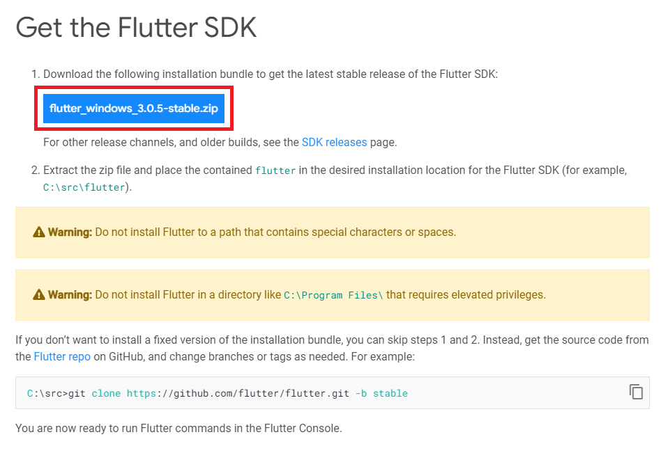 윈도우를 클릭하게 되신다면 조금 아래로 스크롤을 내려보시면 Get the Flutter SDK라는 문구와 함께 stable.zip 파일을 다운로드 받을 수 있는 버튼이 있습니다.
