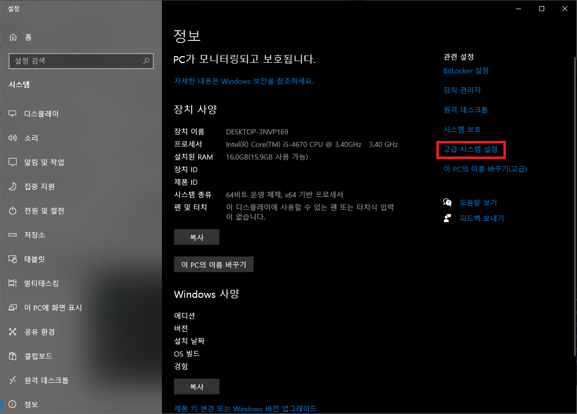3-1. 파일 탐색기 -> 좌측에 보이는 내 PC 우클릭 -> 속성 -> 우측에 있는 고급 시스템 설정