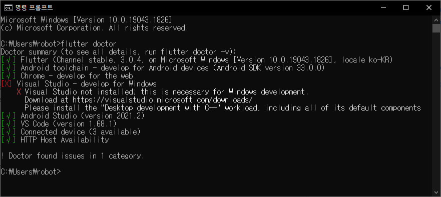 5-2. 최초 실행 시 2번째 줄에 있는 Android toolchain에서 아래의 에러 메세지가 뜨실텐데 이 메시지를 보시게 된다면 아래의 명령어를 cmd에서 실행시켜주시면 됩니다.