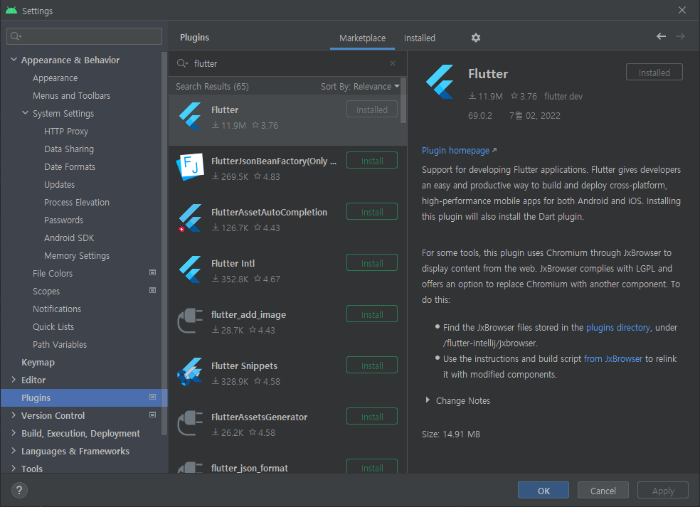 SDK 플러그인을 설치한 후 Plugins에서 flutter를 설치하도록 하겠습니다.