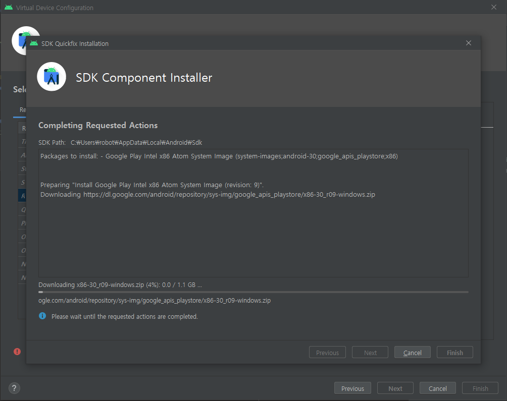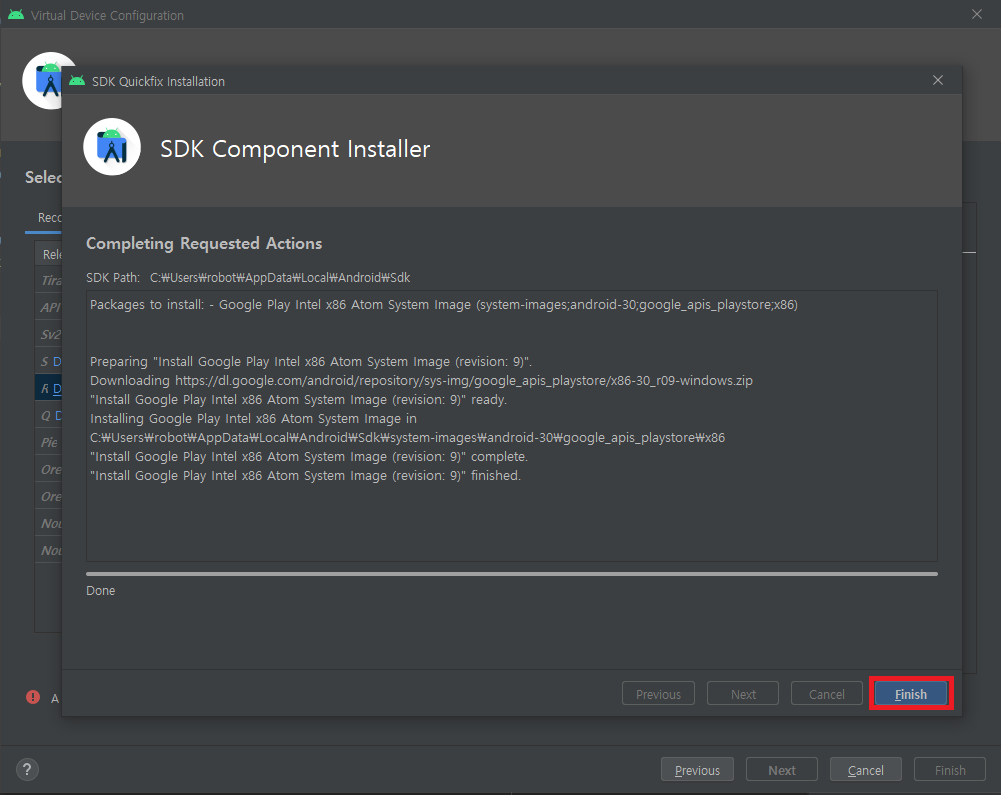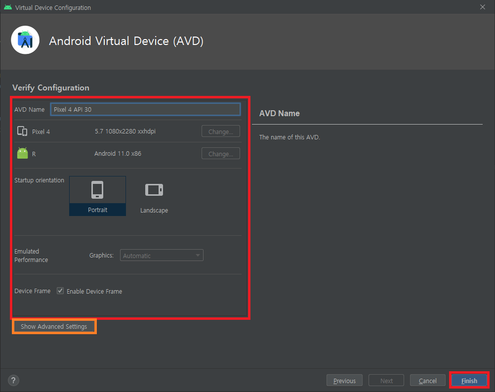 2-5. AVD 이름과 앞서 설정한것들이 제대로 적용이 되었는지 확인하는 과정입니다. 문제가 없다면 Finish!!