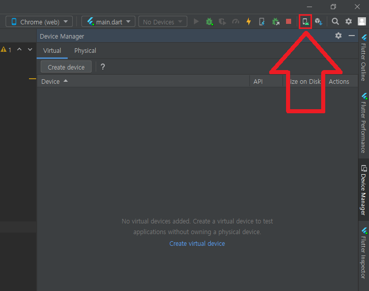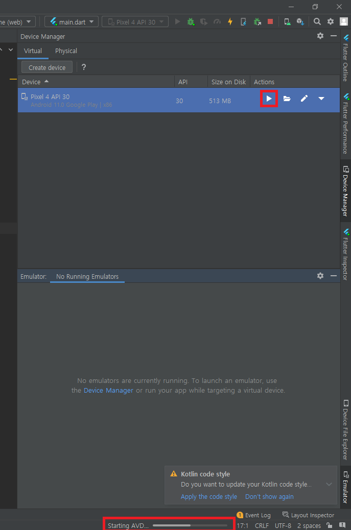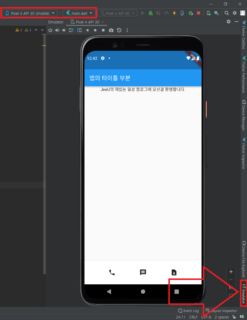 ※ 해당 화면이 안보인다면 하단에 보이는 화살표에 보이는 Emulator(빨간 박스)를 클릭해주시면 디바이스가 뜨게 됩니다.