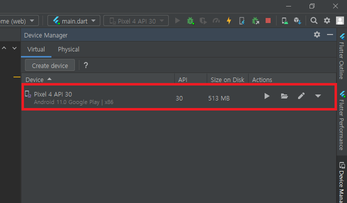 2-6. Device Manager에 AVD Name으로 하나의 디바이스가 생성된걸 확인할 수 있습니다.