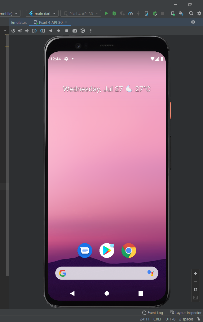 2-8. 제가 만든 소스를 바로 적용하고 싶으시다면 가상의 디바이스를 켜놓은 상태에서 main.dart를 AVD에 맞게 설정해두고 실행하게 된다면 아래와 같이 소스에 맞는 화면이 바로 뜨게 됩니다.