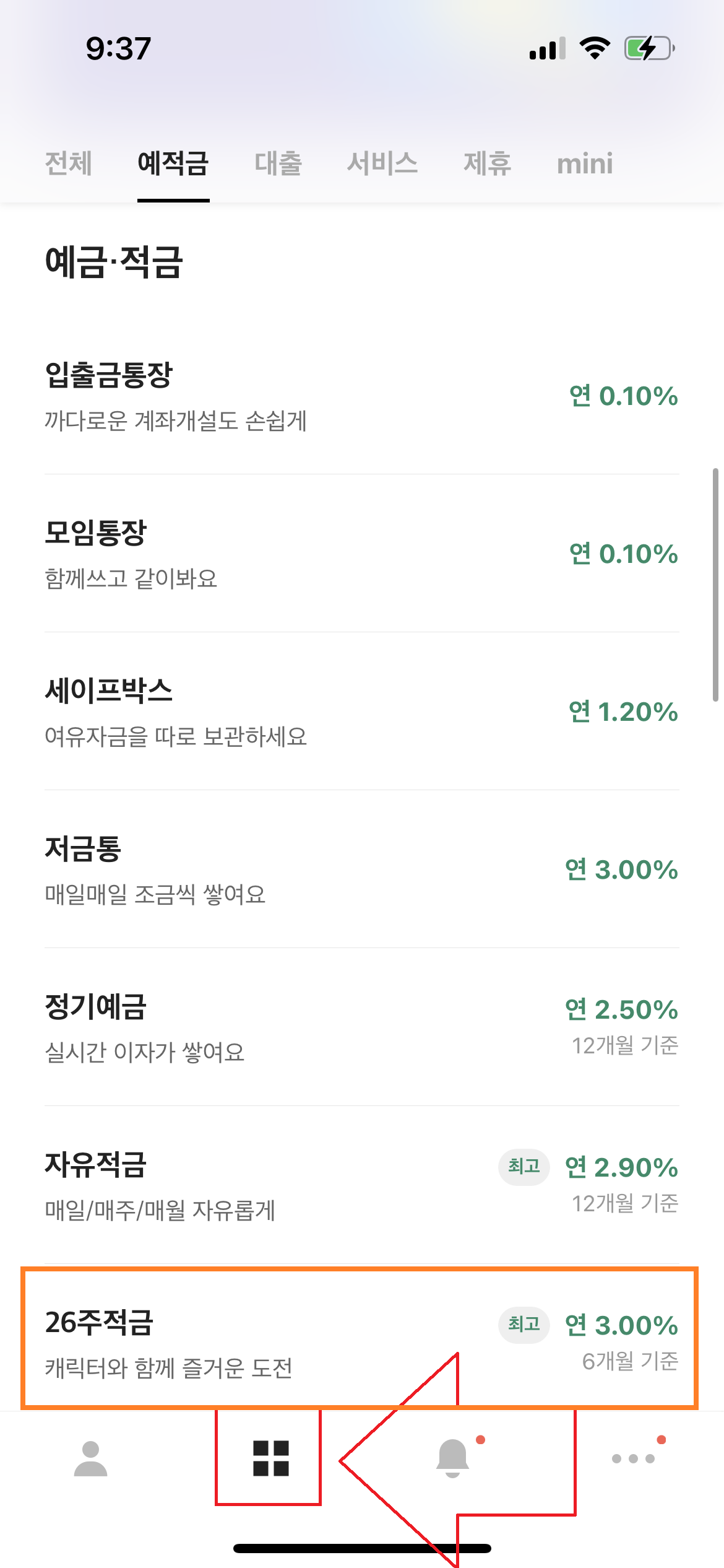 1. 하단에 있는 2번째 탭을 클릭하여 스크롤을 조금 내리면 26주 적금 상품이 보입니다. 해당 상품 클릭