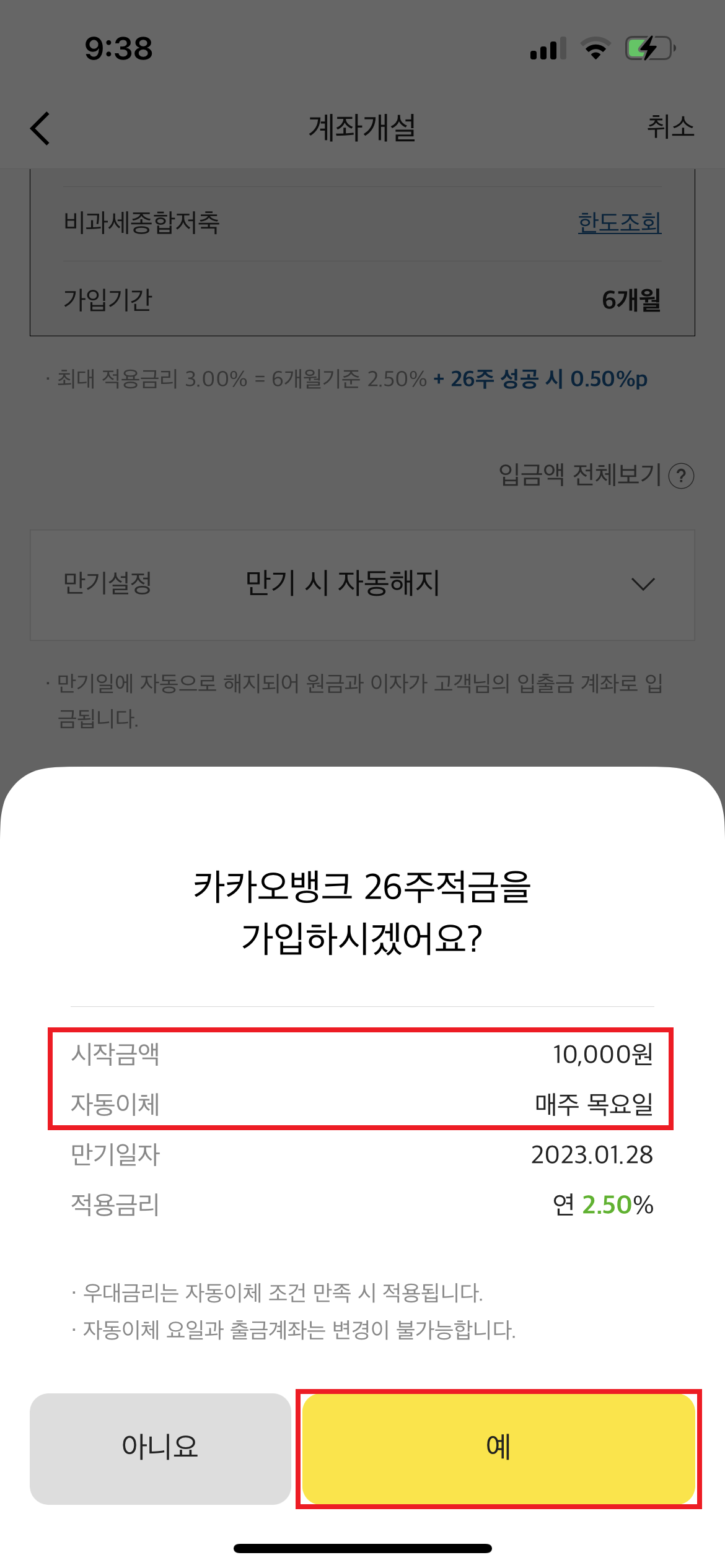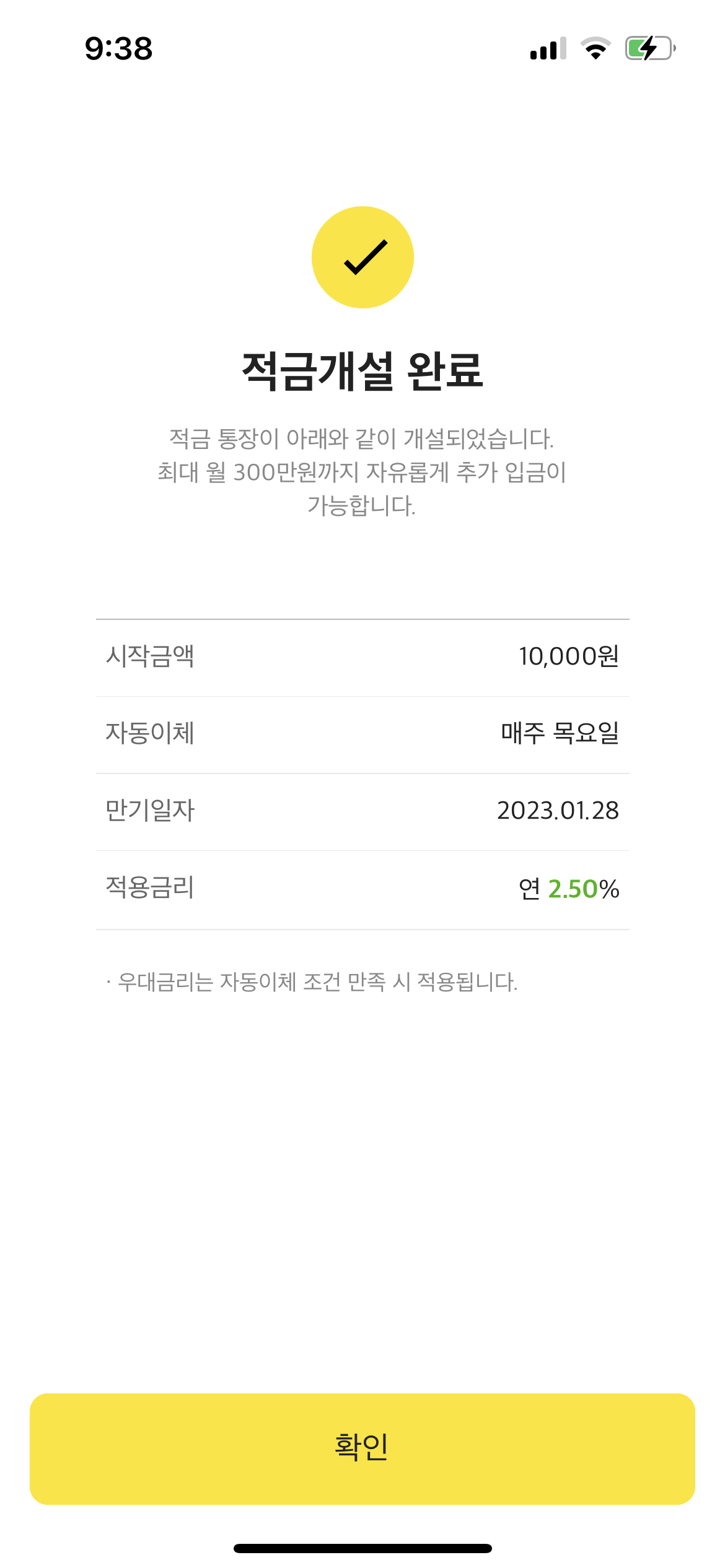 3. 금액과 자동 이체일, 자동 이체 계좌를 선택하여 진행하시면 적금이 바로 개설이 됩니다.