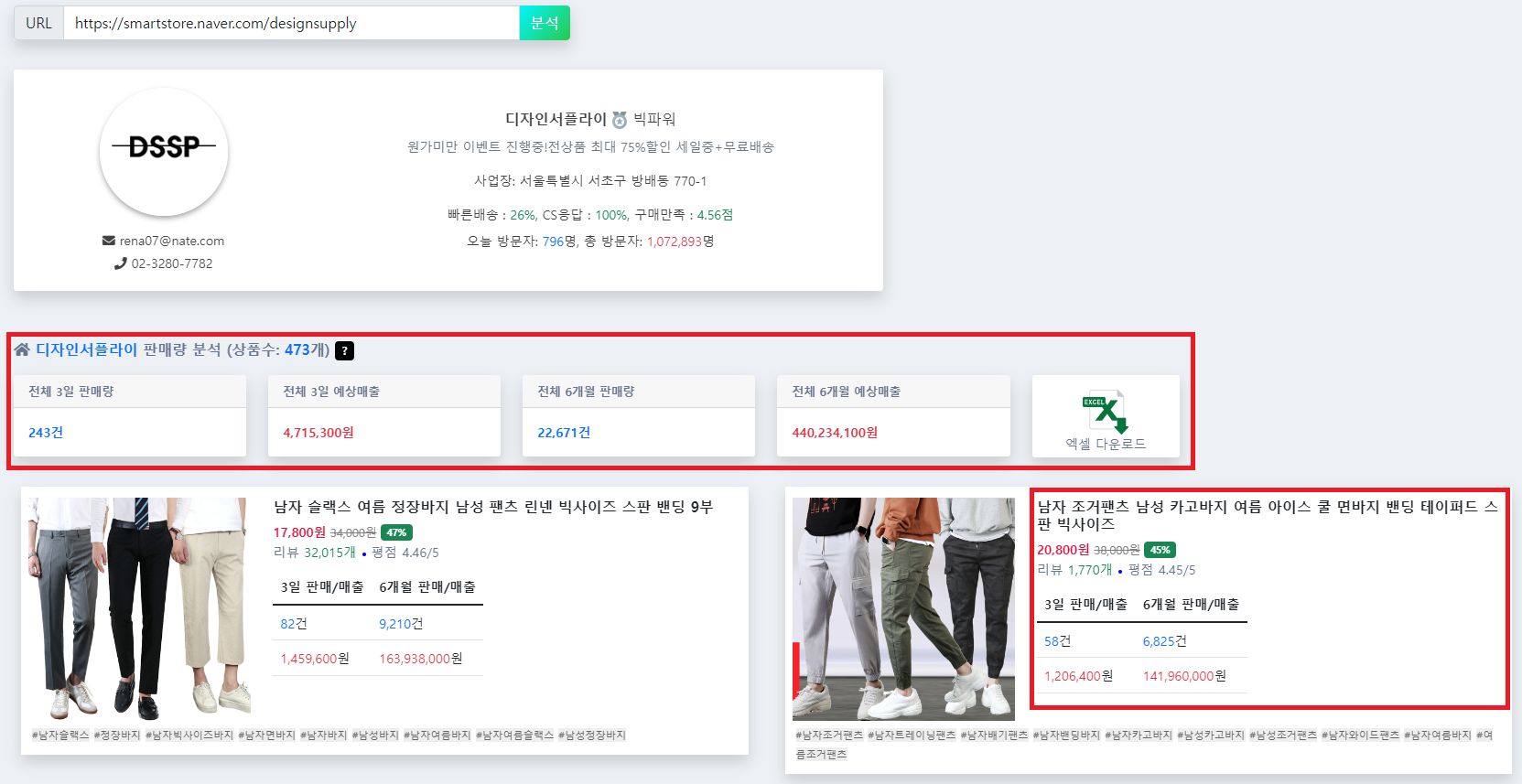 정말 간단하게 스토어 판매량 분석을 원하는 사이트의 URL만 붙여넣어주면 바로 3일 / 6개월 기준으로하여금 정보들이 뜨게 됩니다.