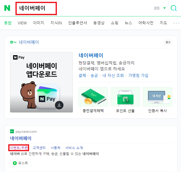 ※ 네이버 로그인 -> 검색창에 네이버페이 입력 -> 하단에 보이는 그림처럼 이벤트/쿠폰 클릭