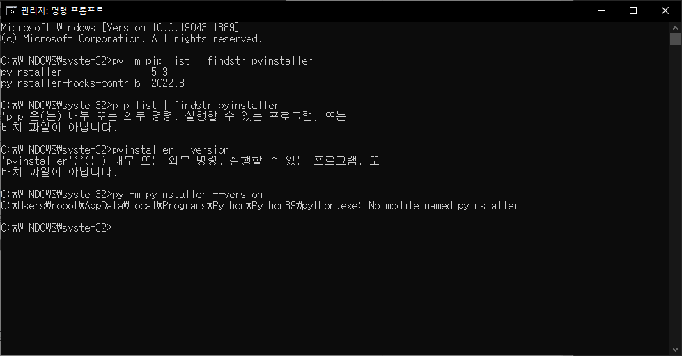 우선 pyinstaller가 설치가 되어있는지 확인을 해보았습니다.