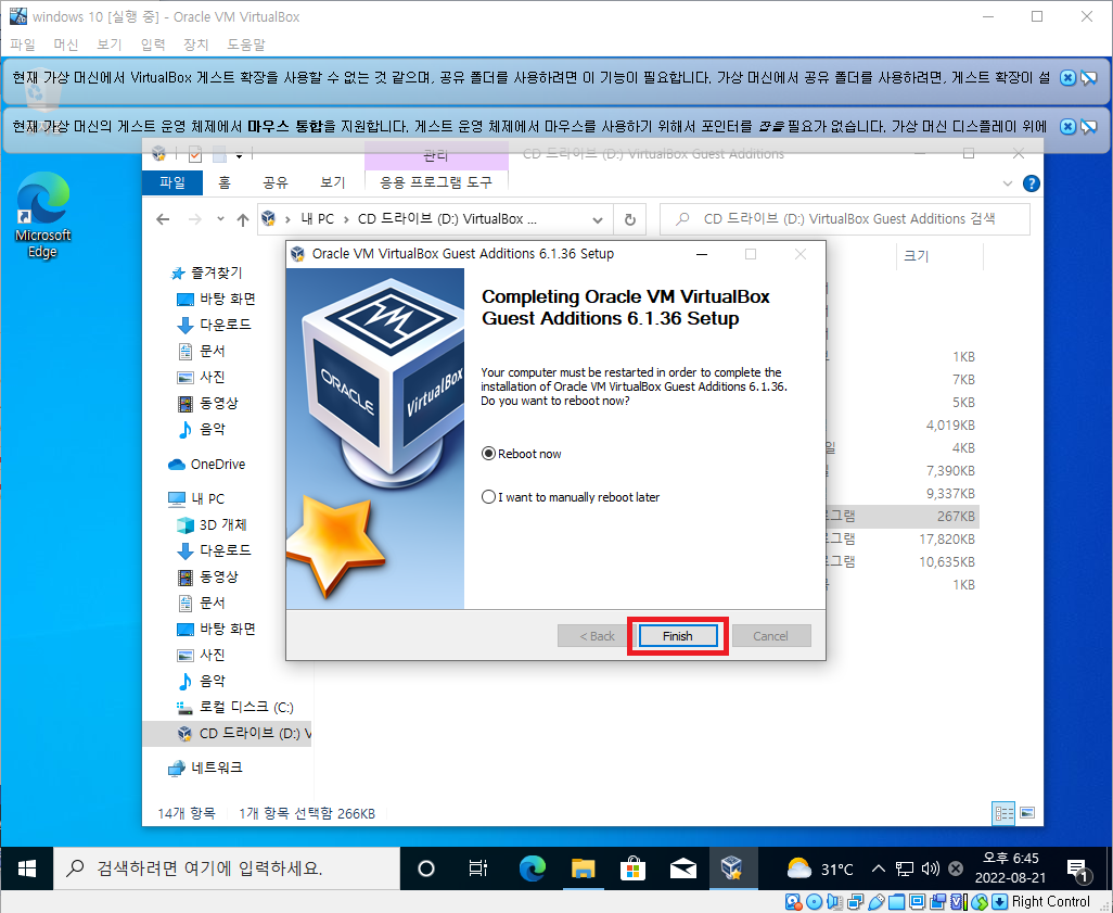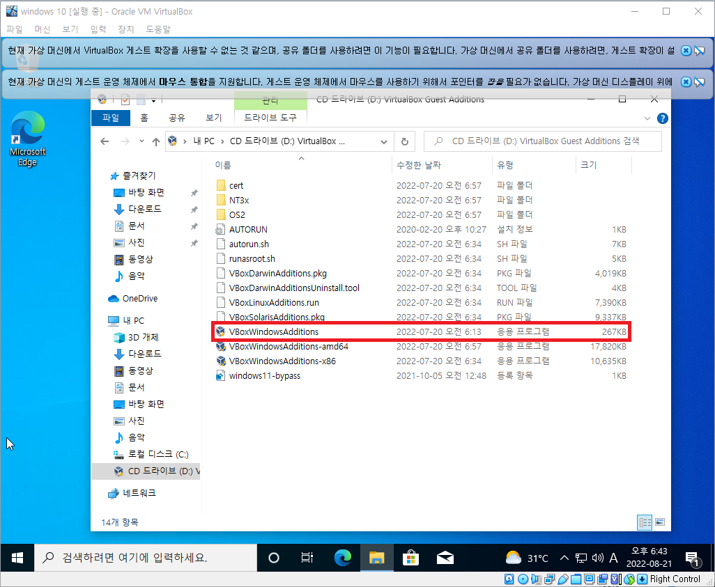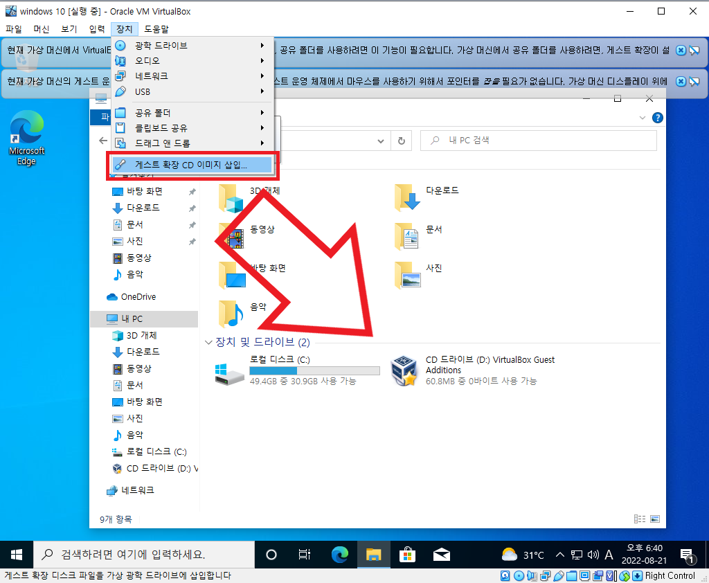 - 버추얼 박스 -> 윗 상단 장치 -> 게스트 확장 CD 이미지 삽입 -> 파일 탐색기 -> 내 PC -> D 드라이브 클릭