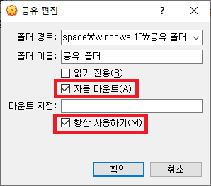 4. 폴더 경로 및 폴더 이름를 설정하고 자동 마운트, 항상 사용하기를 클릭하셔서 확인