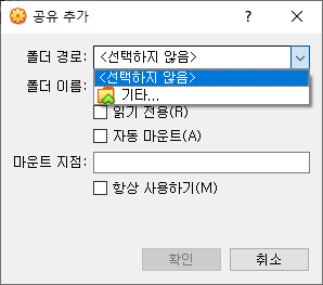 2. 빨간 박스에 있는 공유 추가를 선택 -> 폴더 경로에 있는 기타를 클릭