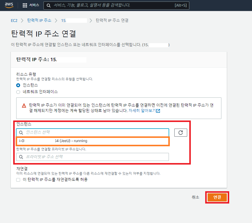 6. 탄력적 IP 주소 연결에서 어떤 인스턴스에 발급받은 해당 IP로 연결을 시켜주는 작업입니다.