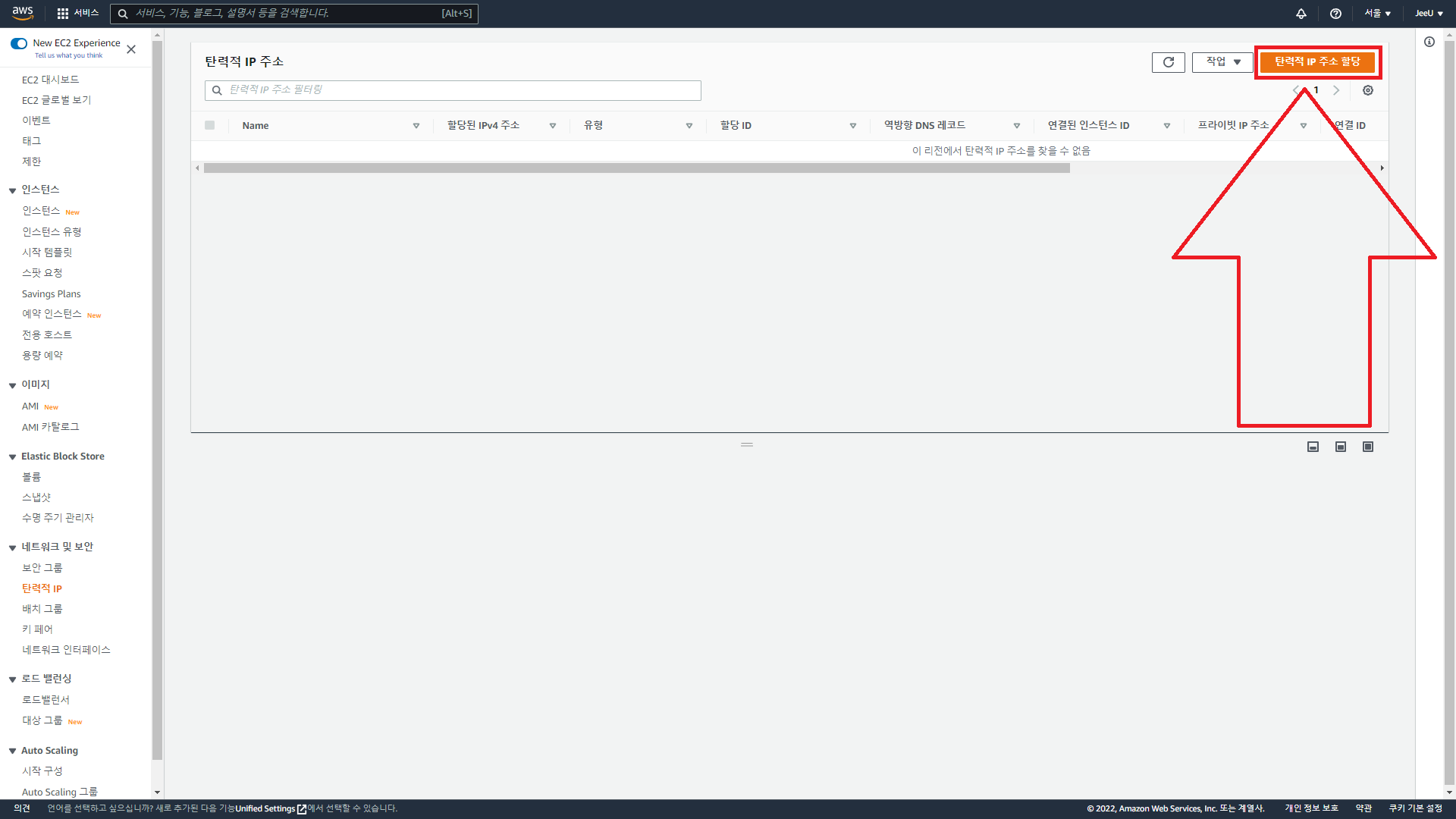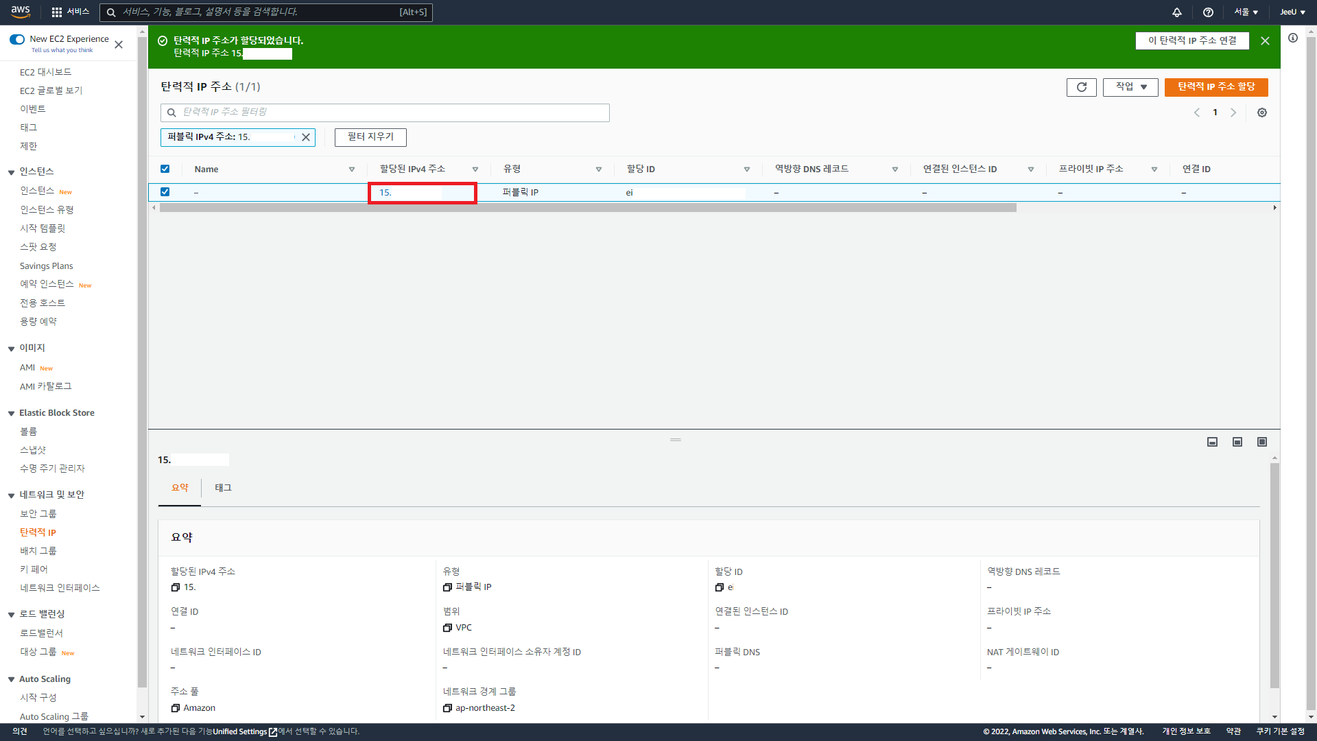 탄력적 IP는 아마존에서 제공하는 퍼블릭 IP말고 사용자가 고정적으로 쓸 수 있게 고정 아이피 하나를 제공해주는 서비스입니다.