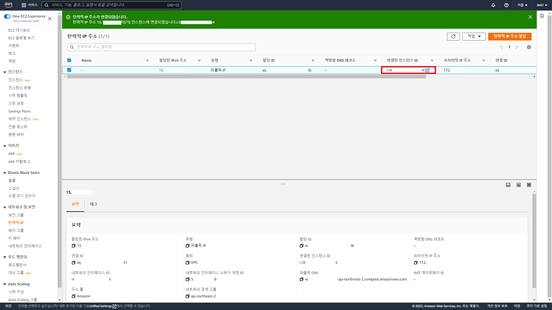 이렇게 인스턴스를 퍼블릭 IP에서 고정 IP로 바꾸는 작업을 해보았습니다.