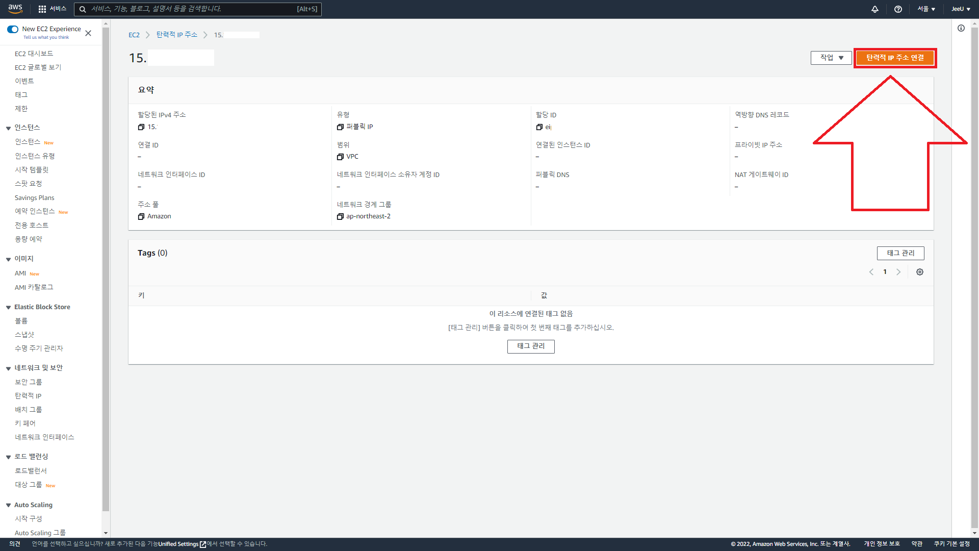 5. 4번에서 IP를 선택하여 상세화면으로 접속하셔서 우측 상단에 있는 탄력적 IP 주소 연결을 클릭