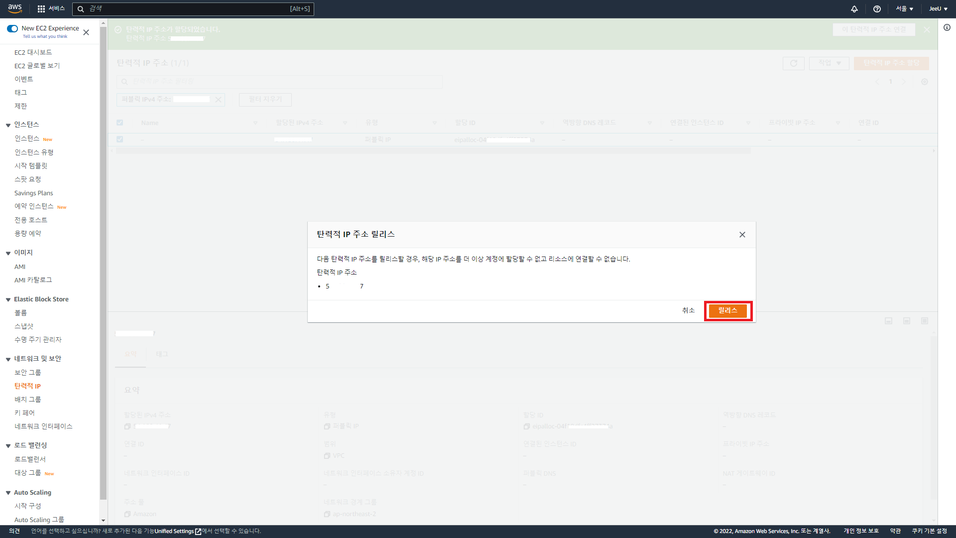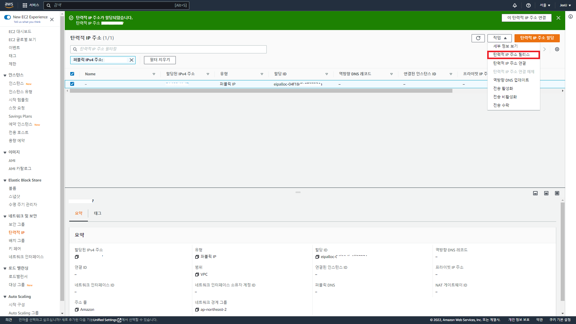 - 삭제할 탄력적 IP를 선택하여 우측 상단에 있는 작업 -> 탄력적 IP 주소 릴리스 클릭