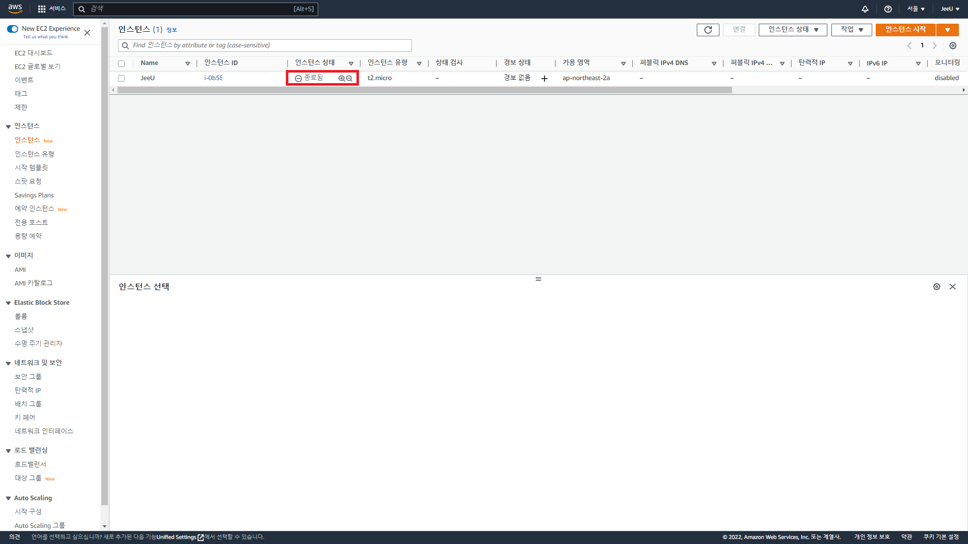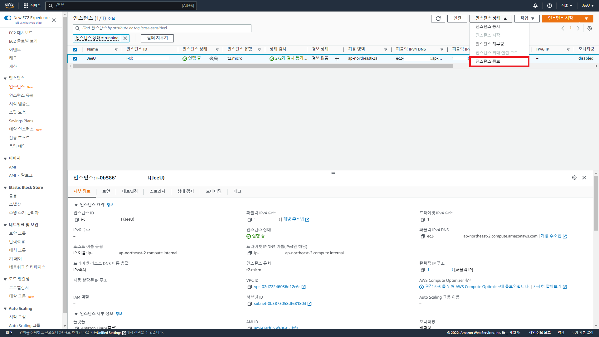 - 삭제하고 싶은 인스턴스를 선택하여 우측 상단에 있는 인스턴스 상태 -> 인스턴스 종료 클릭
