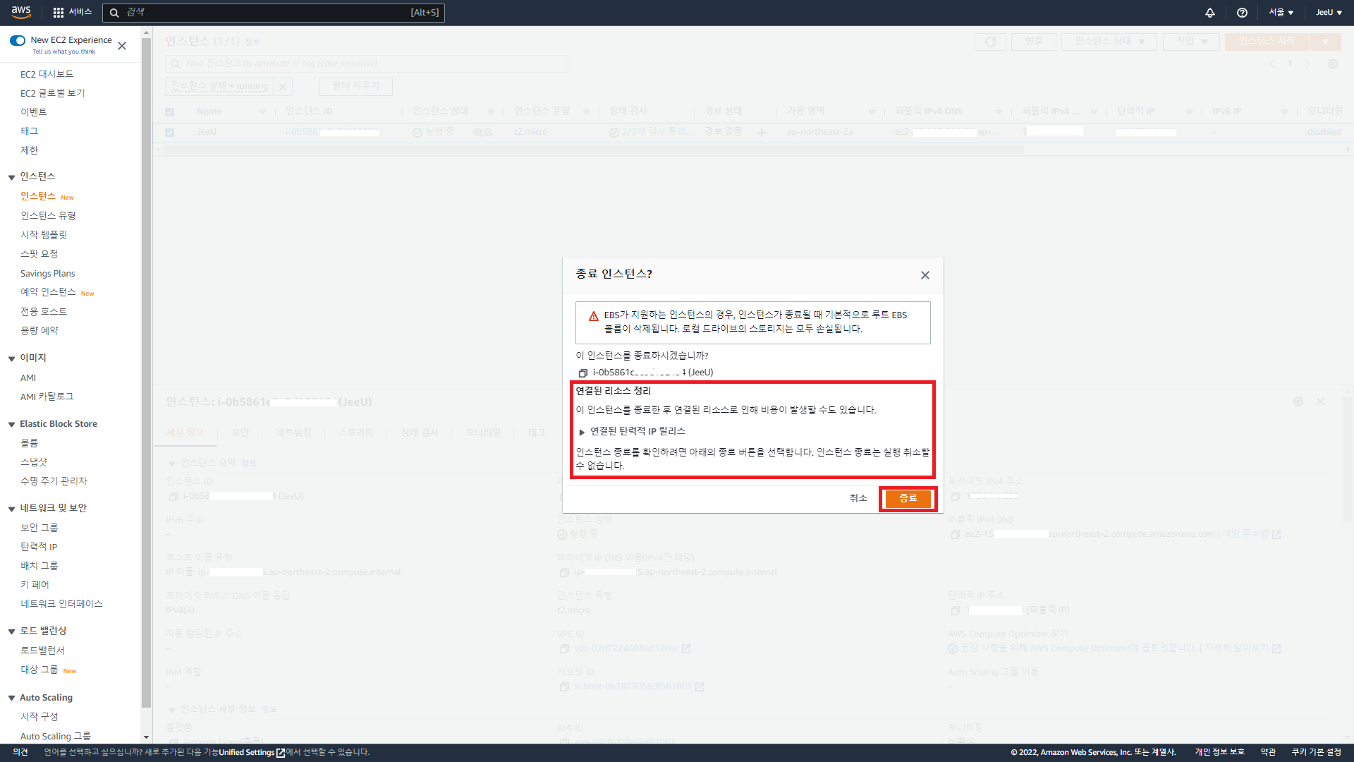- 인스턴스만 종료하게 된다면 연결되어 있던 탄력적 IP는 할당되지 않은 상태가 되어 요금을 청구하게 됩니다.