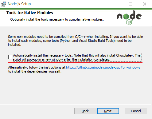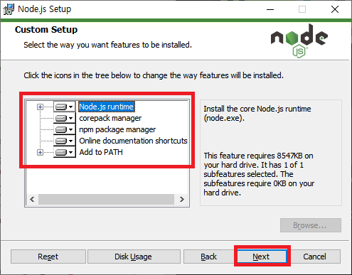 nodejs 설치 위치 설정 (필자는 디폴트) -> Next -> 설치 목록들이 눈에 보이는데 기본적으로 Node가 설치하고 되고 npm도 같이 설치가 됩니다! 확인만 하시고 Next