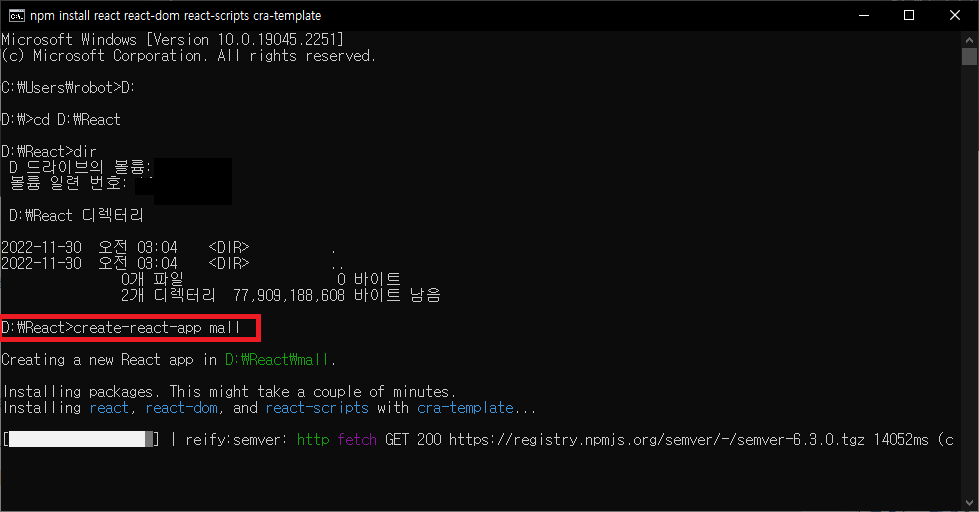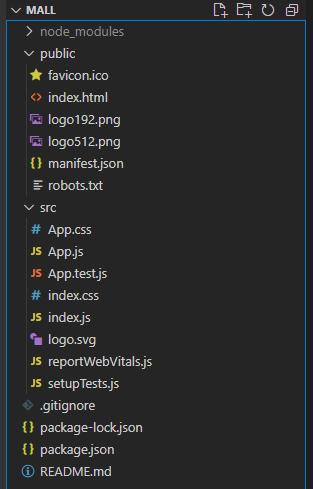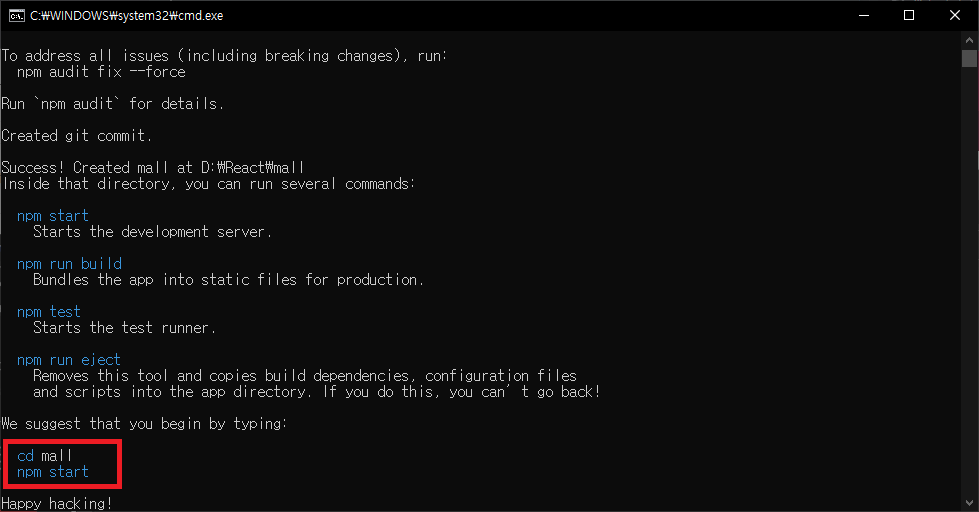 해당 명령어로 프로젝트명은 mall로 하여금 리액트 프로젝트를 만들었습니다!