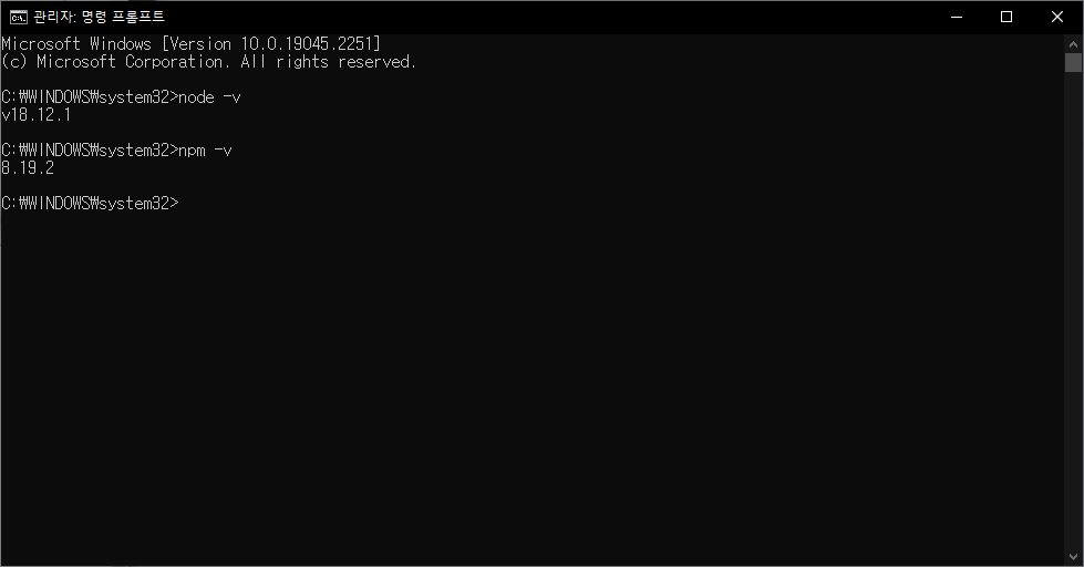 명령 프롬프트(cmd)에서 node와 npm이 정상적으로 설치가 되었는지 node -v 및 npm -v 으로 확인해주시면 됩니다!