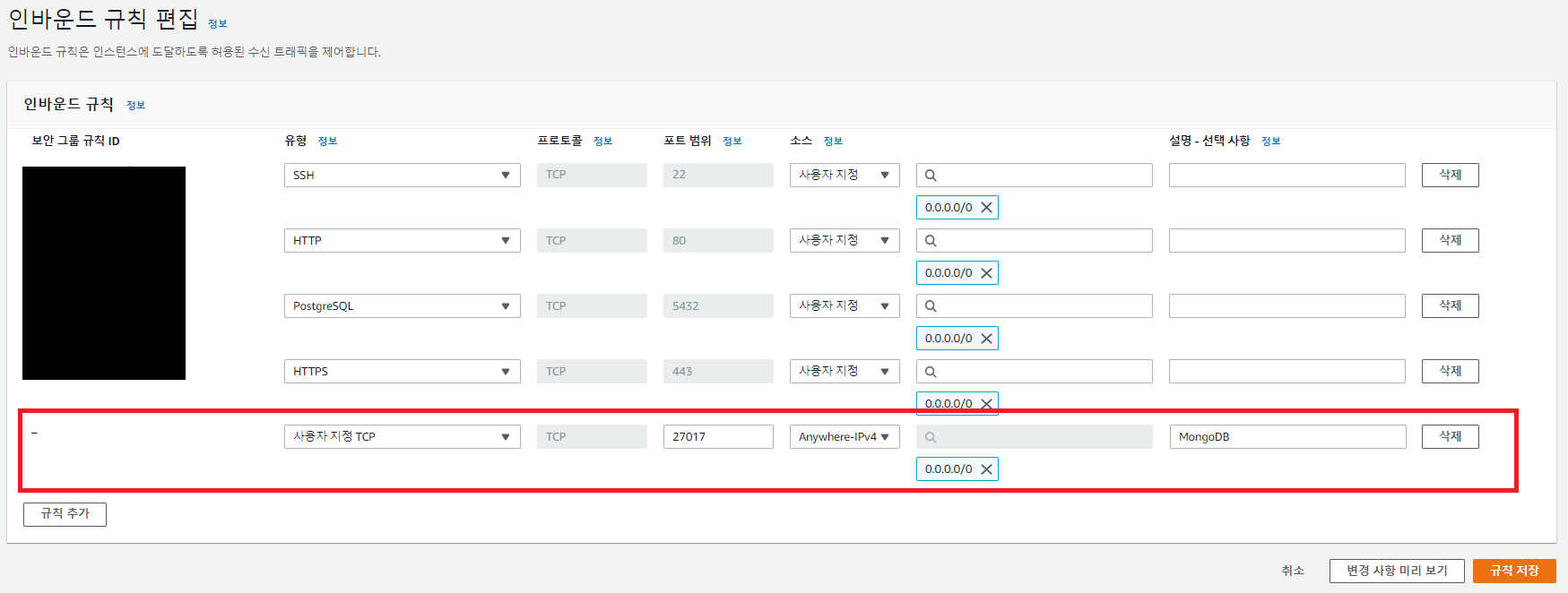 이전 포스트그레스(Postgresql)와 마찬가지로 아마존에서 보안그룹에 해당 포트를 등록해줘야 합니다.