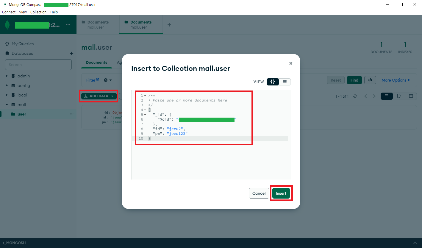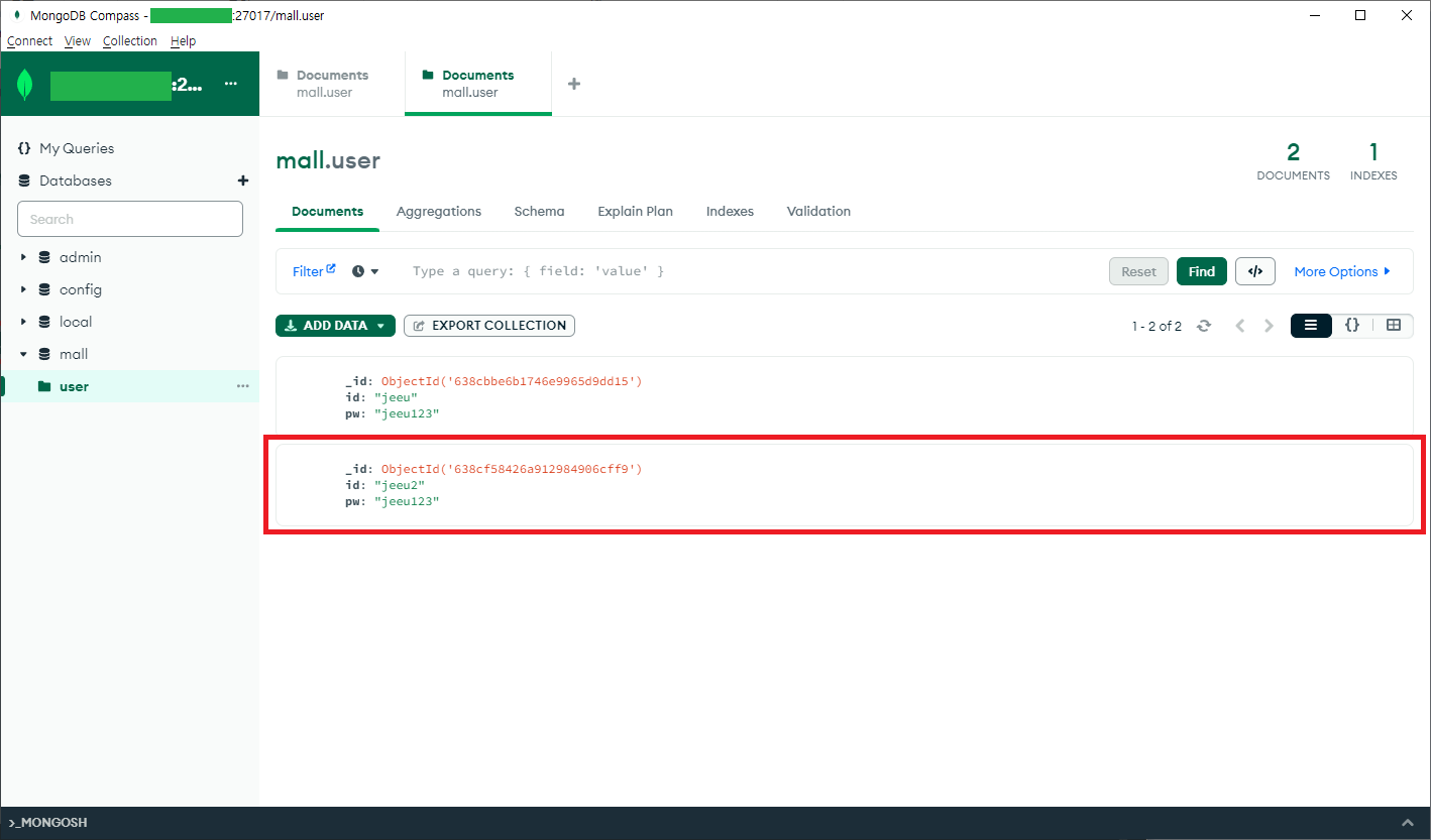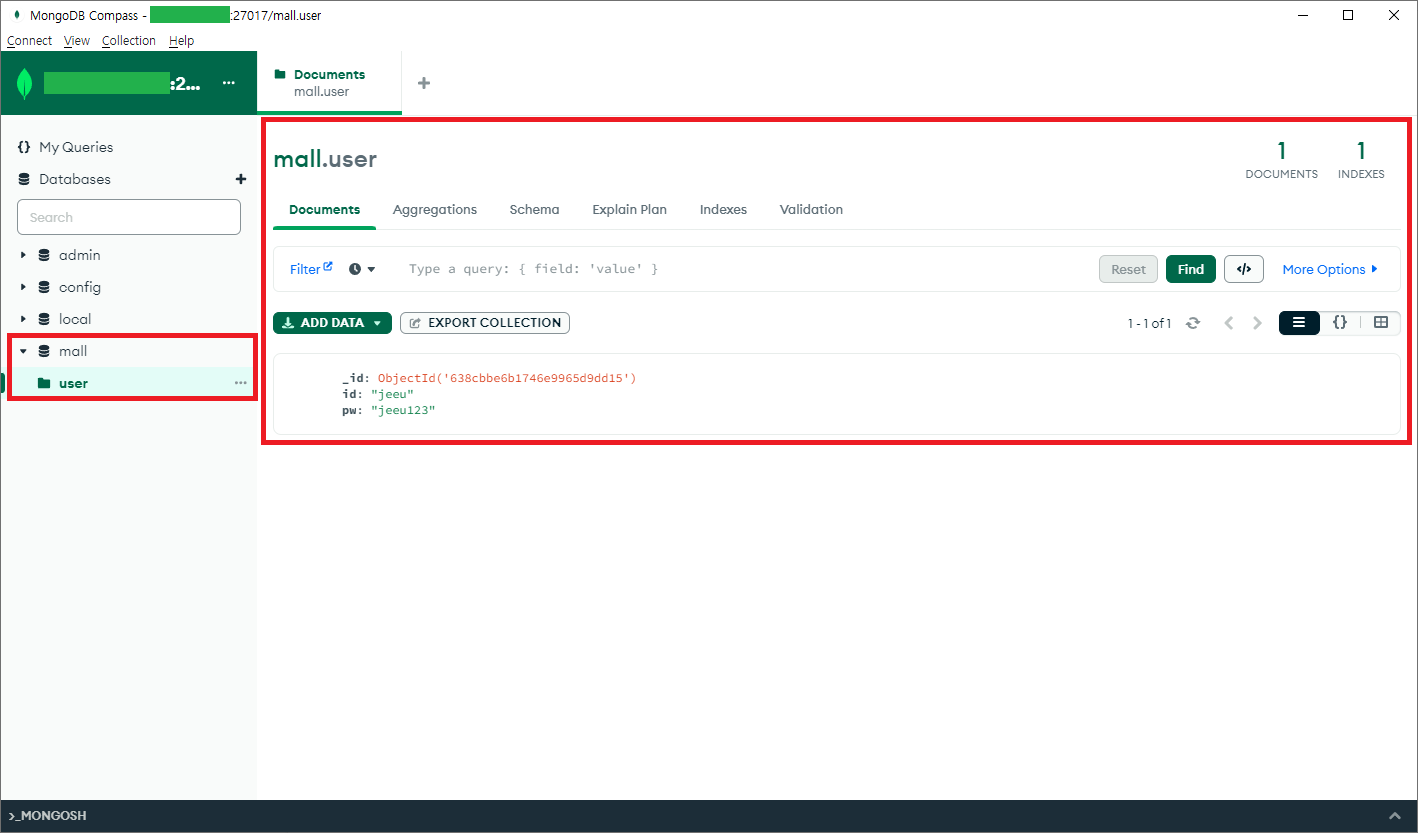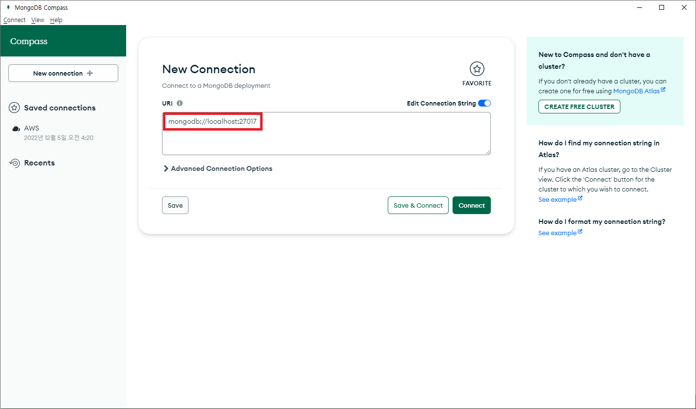 4. Mongo Compass 툴을 이용하여 MongoDB 연동