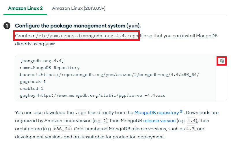 필자처럼 OS를 Amazon Linux 2로 설치를 하셨다면 몽고 디비 사이트에 Amzon 설치 방법을 참고하시면 될 것 같습니다.