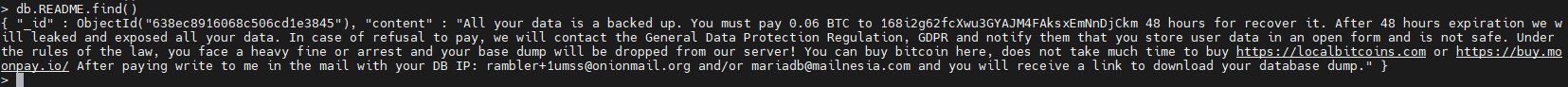 All your data is a backed up. You must pay 0.06 BTC to 168i2g62fcXwu3GYAJM4FAksxEmNnDjCkm 48 hours for recover it. After 48 hours expiration we will leaked and exposed all your data. In case of refusal to pay, we will contact the General Data Protection Regulation, GDPR and notify them that you store user data in an open form and is not safe. Under the rules of the law, you face a heavy fine or arrest and your base dump will be dropped from our server! You can buy bitcoin here, does not take much time to buy https://localbitcoins.com or https://buy.moonpay.io/ After paying write to me in the mail with your DB IP: rambler+1umss@onionmail.org and/or mariadb@mailnesia.com and you will receive a link to download your database dump.