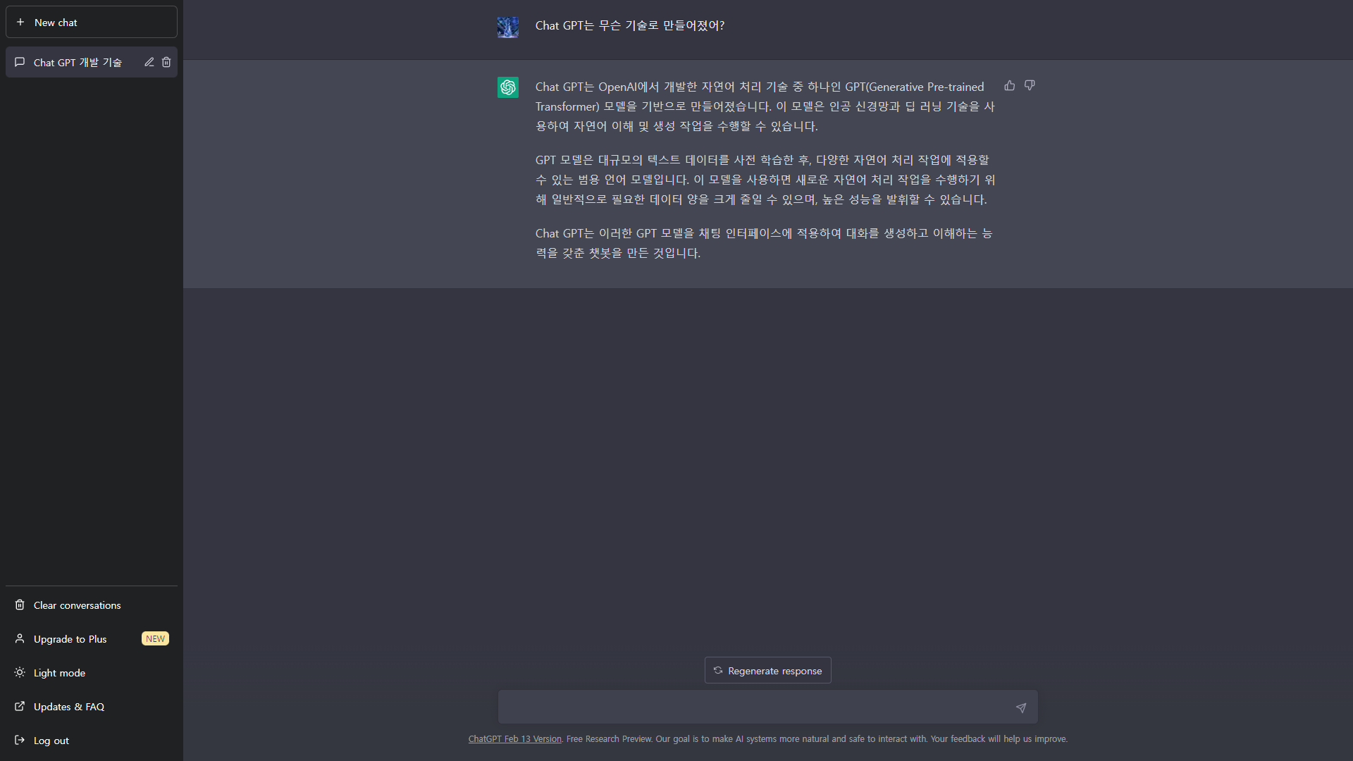 - "Generative Pre-trained Transformer for Chat"이고 OpenAI에서 딥러닝 기술인 Transformer을 사용하여 만든 모델을 뜻 합니다.