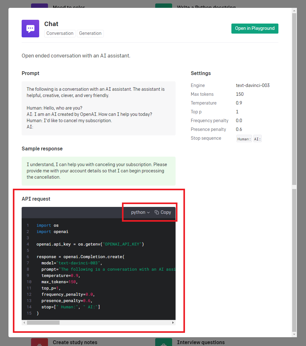 해당 Chat을 클릭하면 아래의 그림처럼 나오게 되는데 아래의 API request python 버전으로 카피를 해줍니다.