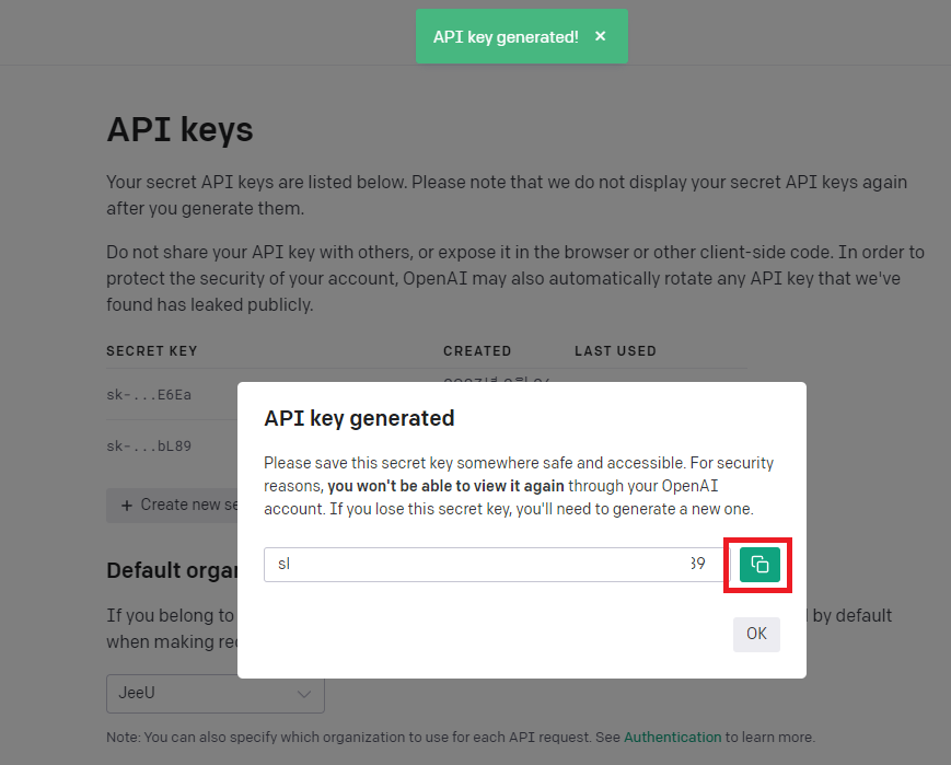 4. 해당 키값은 복사할 수 있는 기회는 팝업으로 뜬 순간뿐입니다. 다른 작업 공간에서도 작업하고 싶다면 해당 키값을 다른 곳에 복사하여 저장해두고 쓰시길 바랍니다.