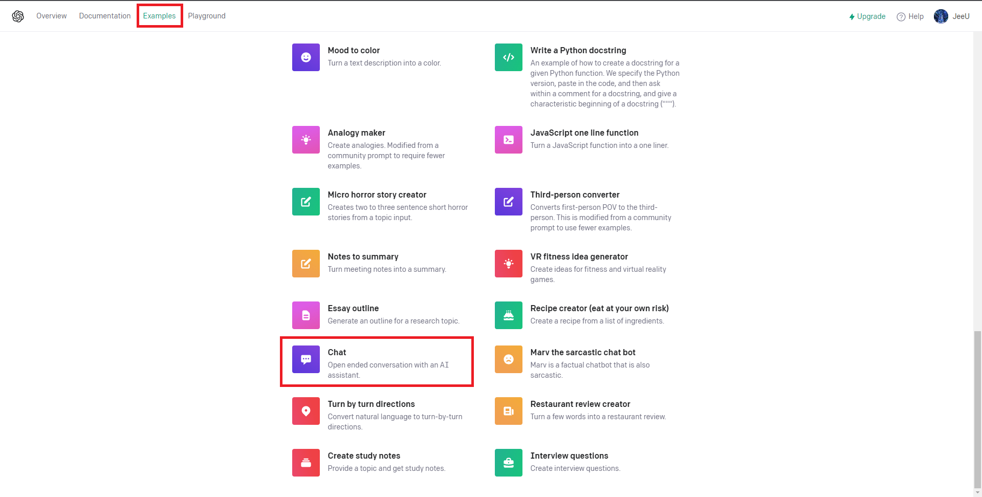 5. Examples 탭으로 들어와서 스크롤을 내리게 되면 Chat 이라는 API를 사용할 수 있도록 예시가 나와있습니다.