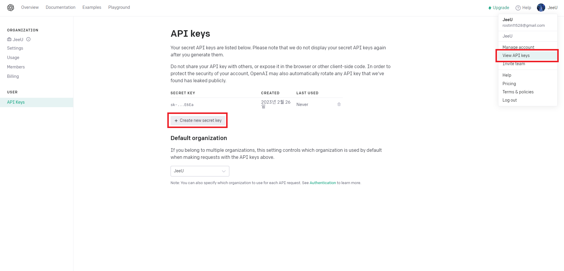 3. 프로필 메뉴에 있는 View API Keys를 클릭하여 해당 메뉴로 와줍니다.