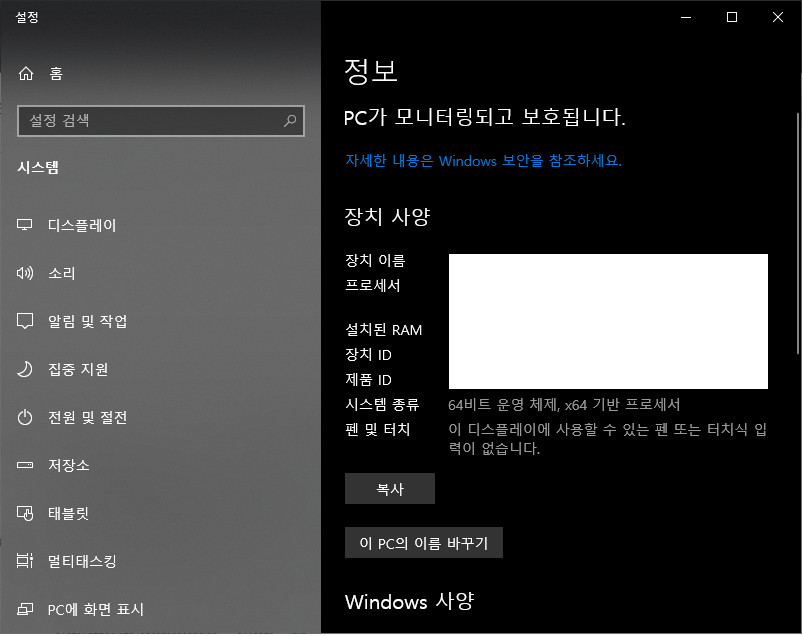 해당 버전은 내 PC -> 속성을 가시게 되면 아래와 같은 화면이 나오면서 버전이 나오게 됩니다.