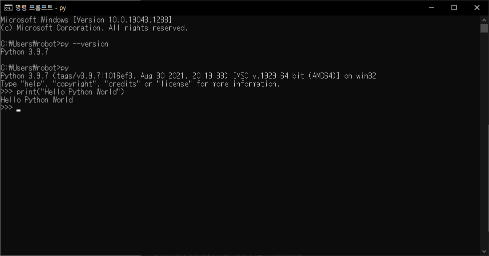 py를 입력하시게 되면 파이썬의 버전과 입력창이 바뀌게 됩니다.