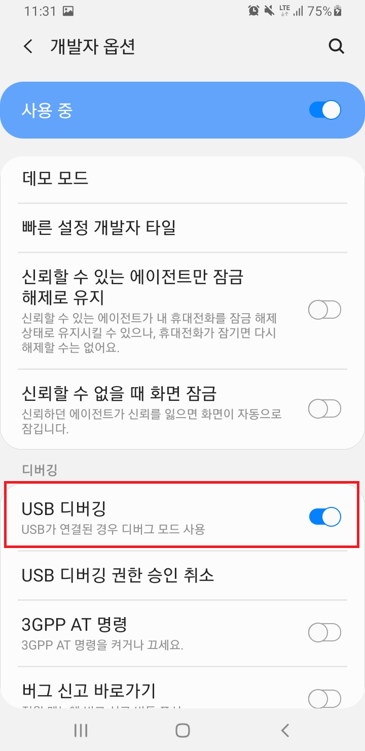 해당 탭에서 USB 디버깅을 ON 시켜주시면 준비가 됐습니다~