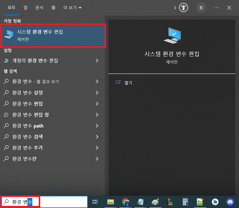 윈도우 키 -> "환경 변수" 입력 후 클릭