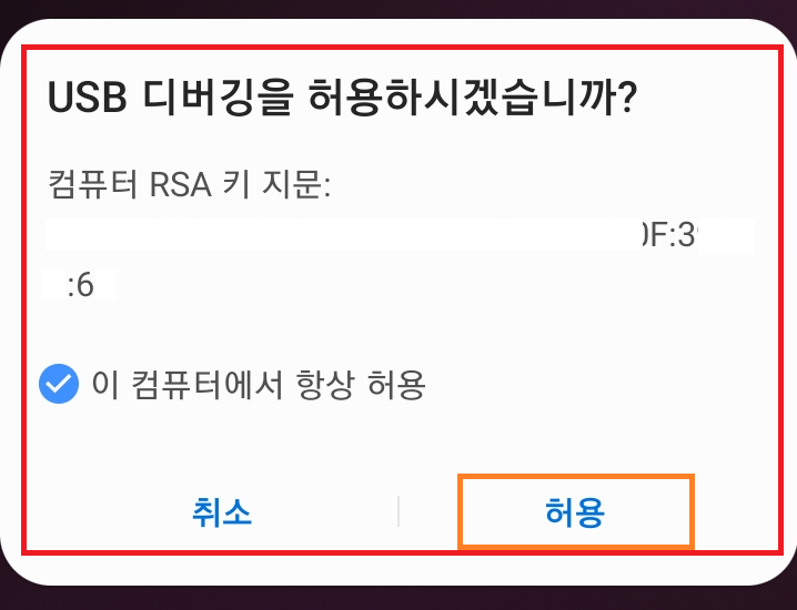 해당 상태에서 핸드폰을 보시게 된다면 아래의 창이 떠있을 겁니다. 허용을 클릭해주시면 됩니다.