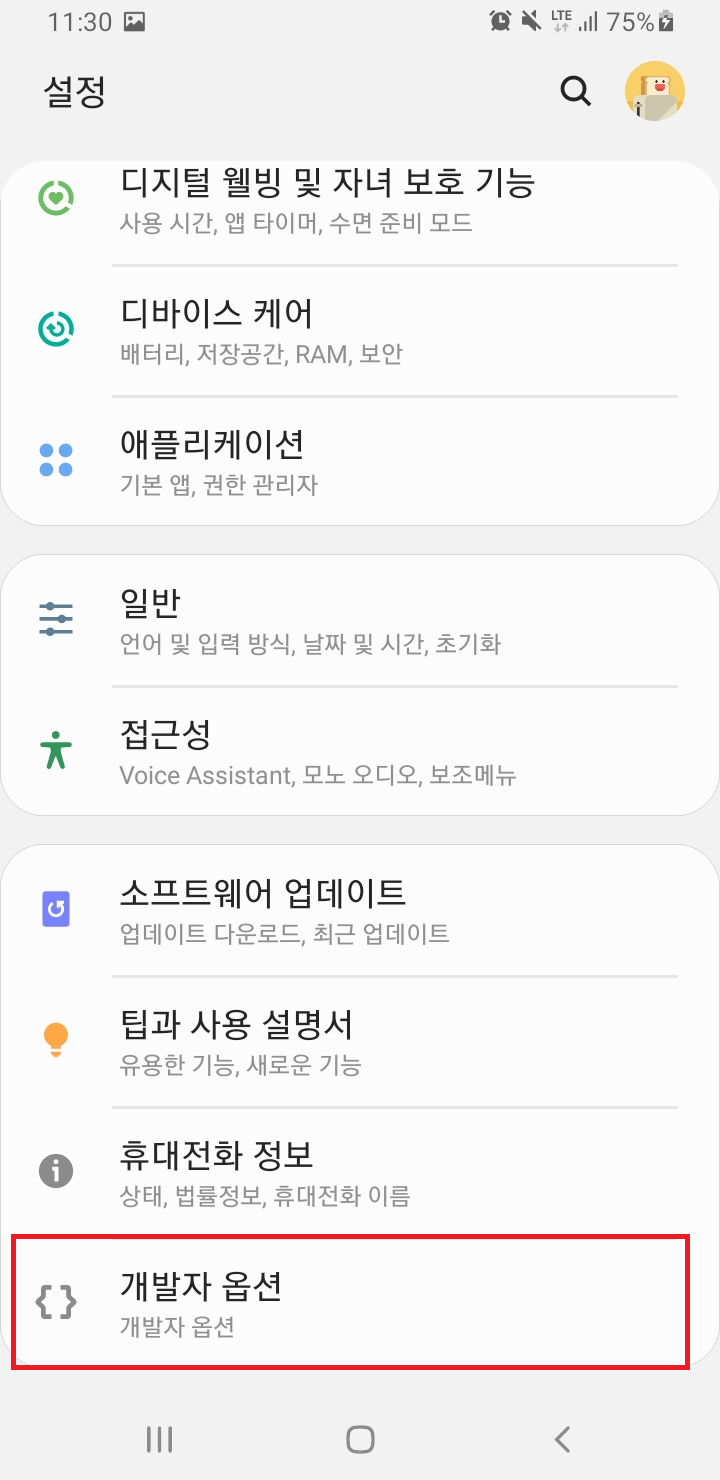 - 설정 -> 휴대전화 정보 -> 소프트웨어 정보 -> 빌드번호를 7번 눌러주신다면 설정으로 돌아와서 휴대전화 정보 아래에 개발자 옵션이라는 탭이 하나 생겼을 겁니다.