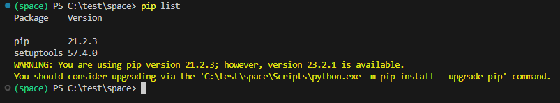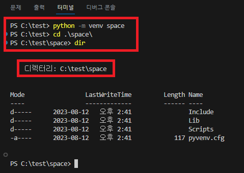 ex) (C:\test 위치에 space라는 가상환경 폴더를 만드는 겁니다)