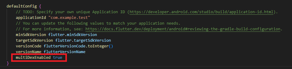 해당 파일에 있는 defaultConfig 부분을 아래와 같이 multiDexEnabled true 를 추가해주시면 해결이 됩니다.