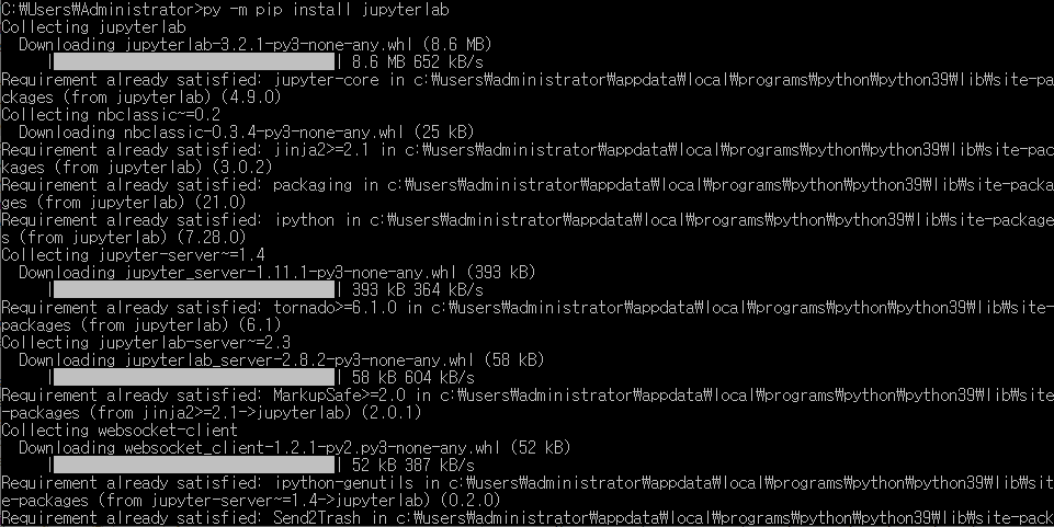 아래 그림과 같이 py -m pip install jupyterlab이라고 적어주시게 되면 주피터 노트북 설치가 진행됩니다.