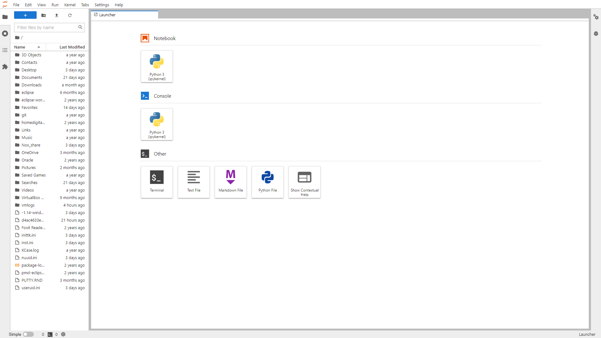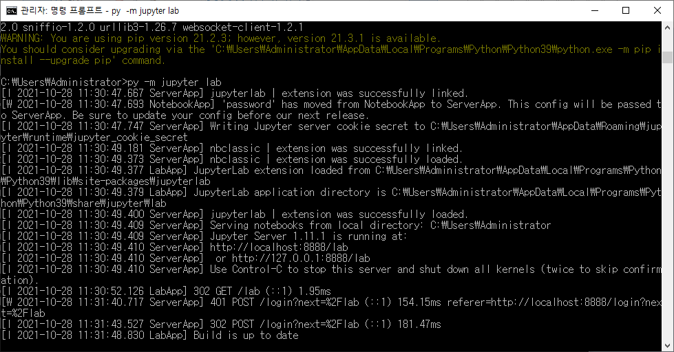 아래 그림과 같이 py -m jupyter lab 을 치시게 되면 주피터 노트북을 실행할 수 있습니다.