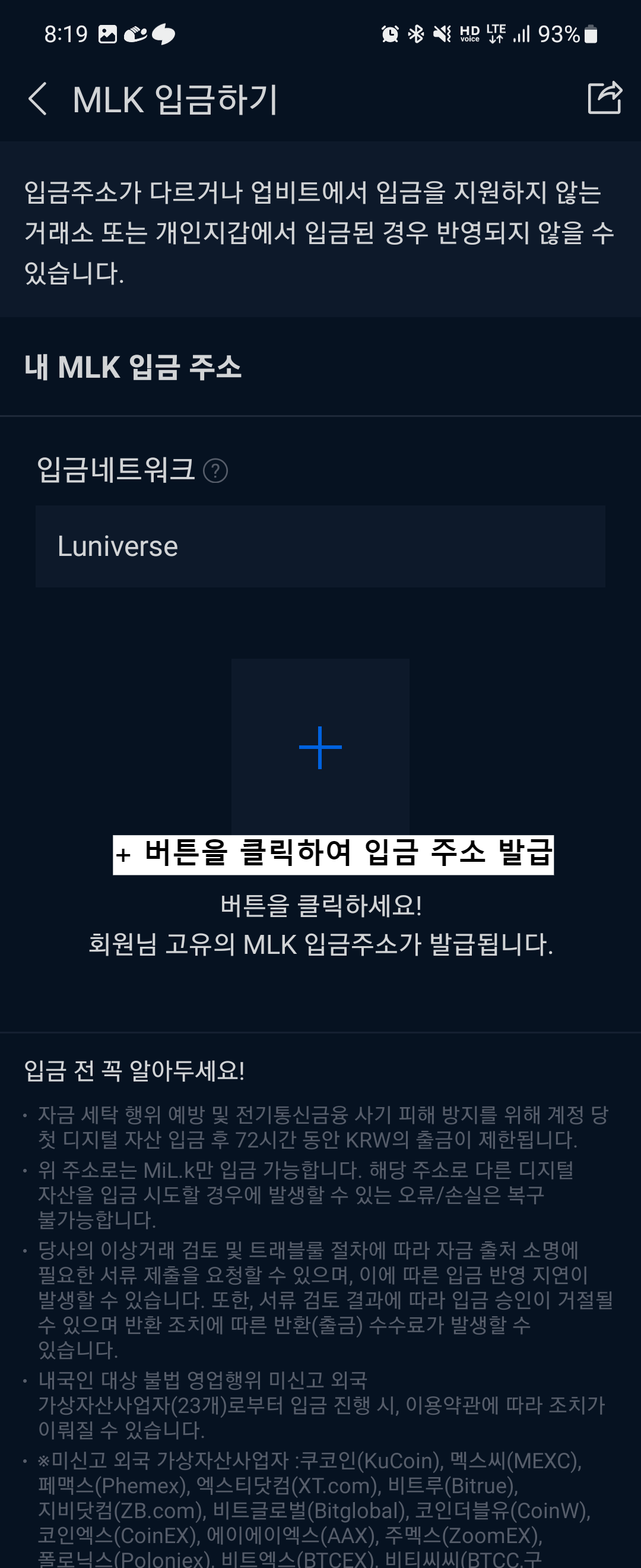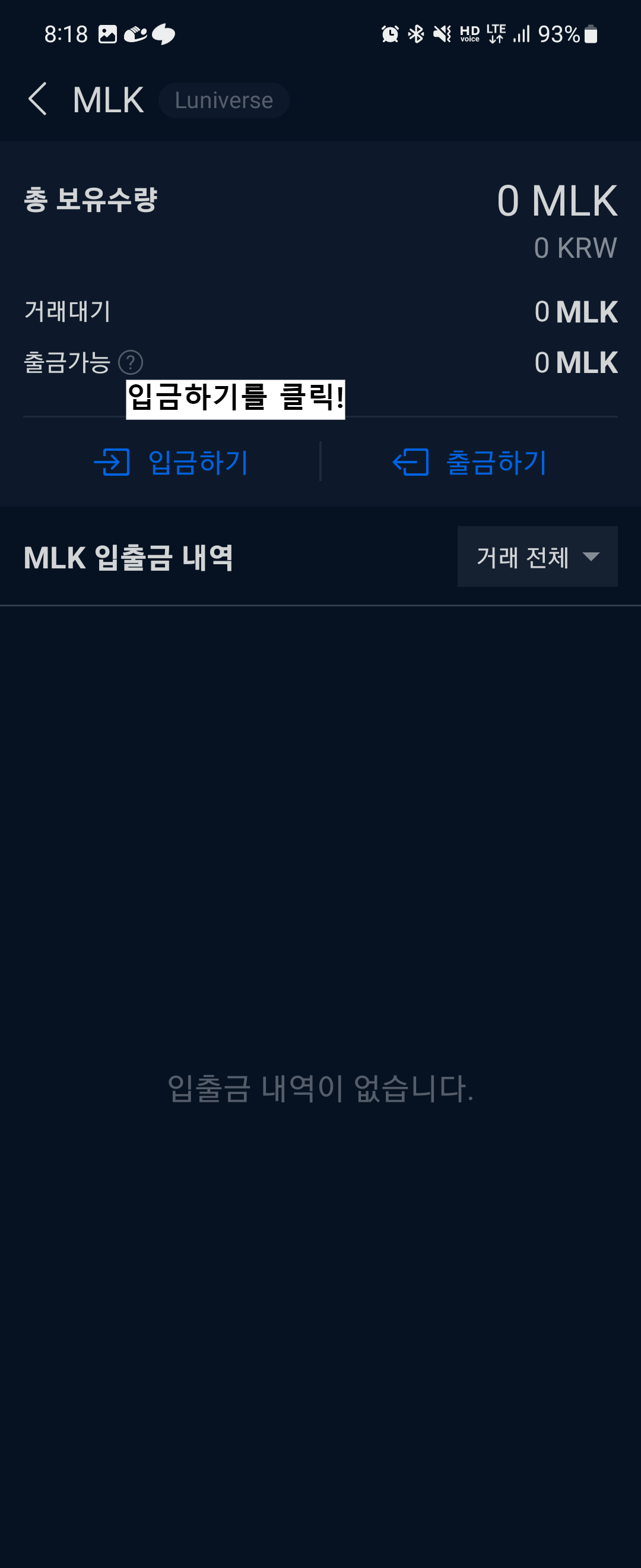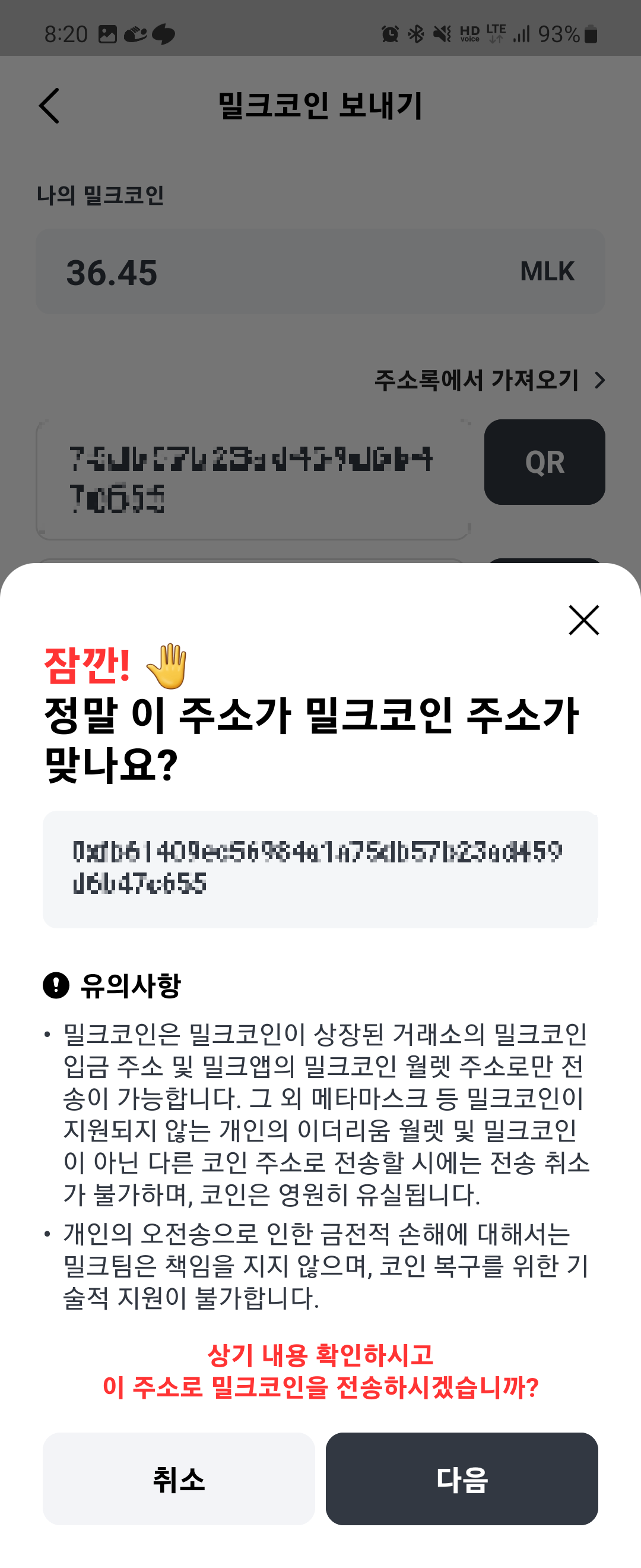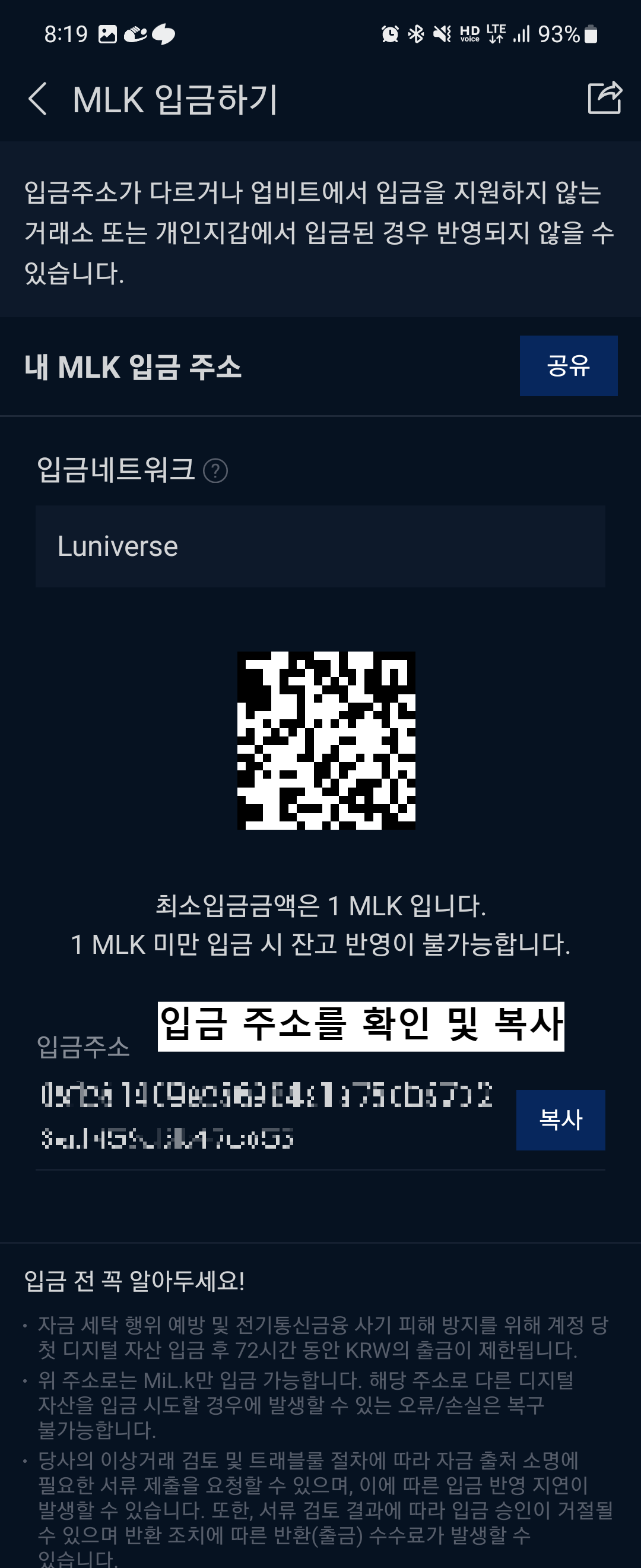 - MILK 코인을 입금할 주소 확인