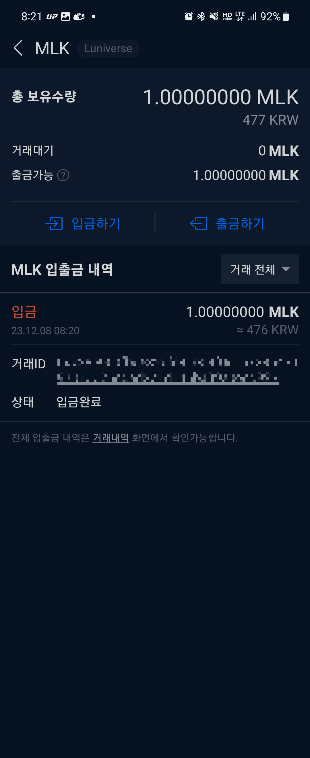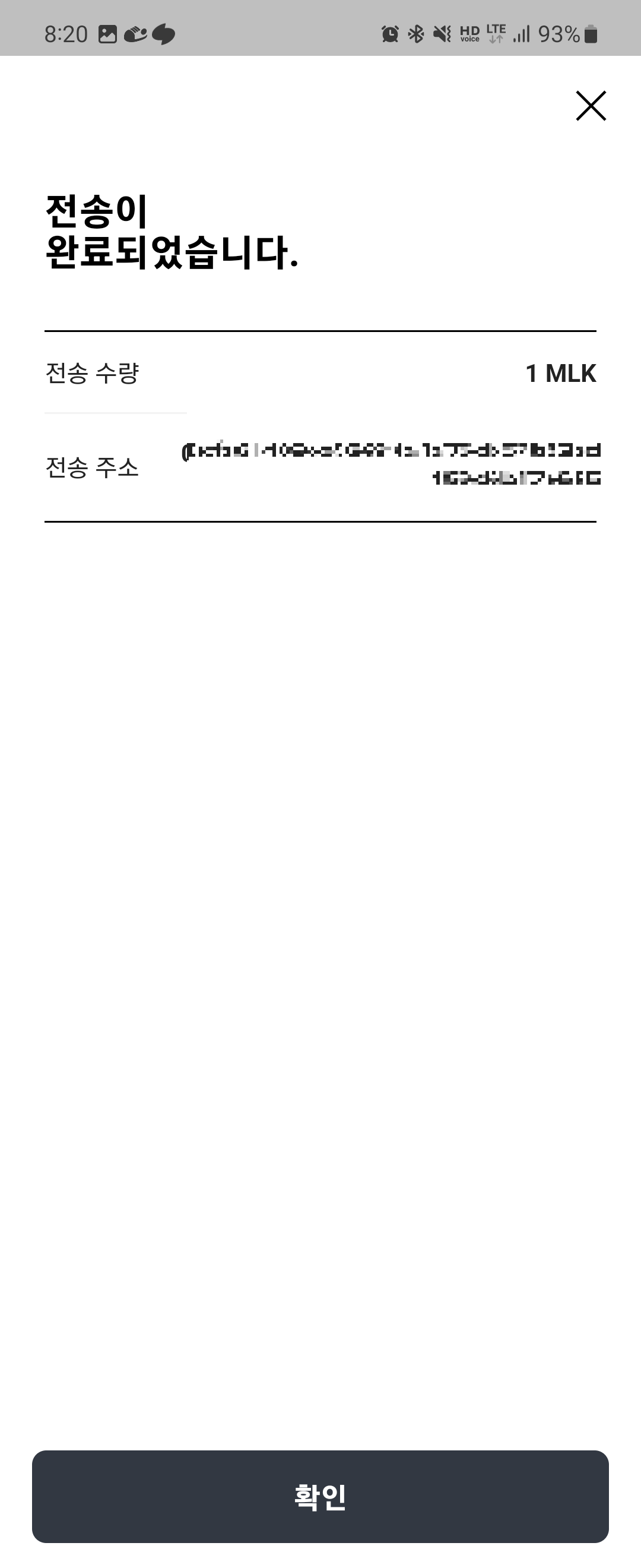 3. 전송이 완료되면 아래처럼 뜨고 시간이 조금 지나게 되면 업비트에서 밀크 코인을 확인하실 수 있습니다!