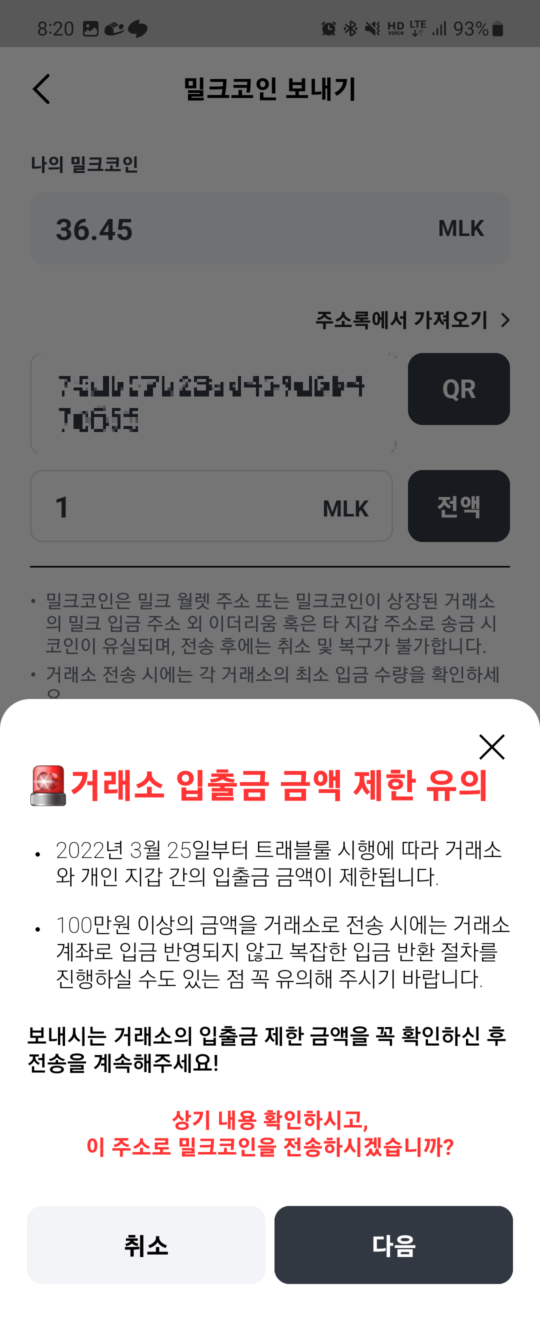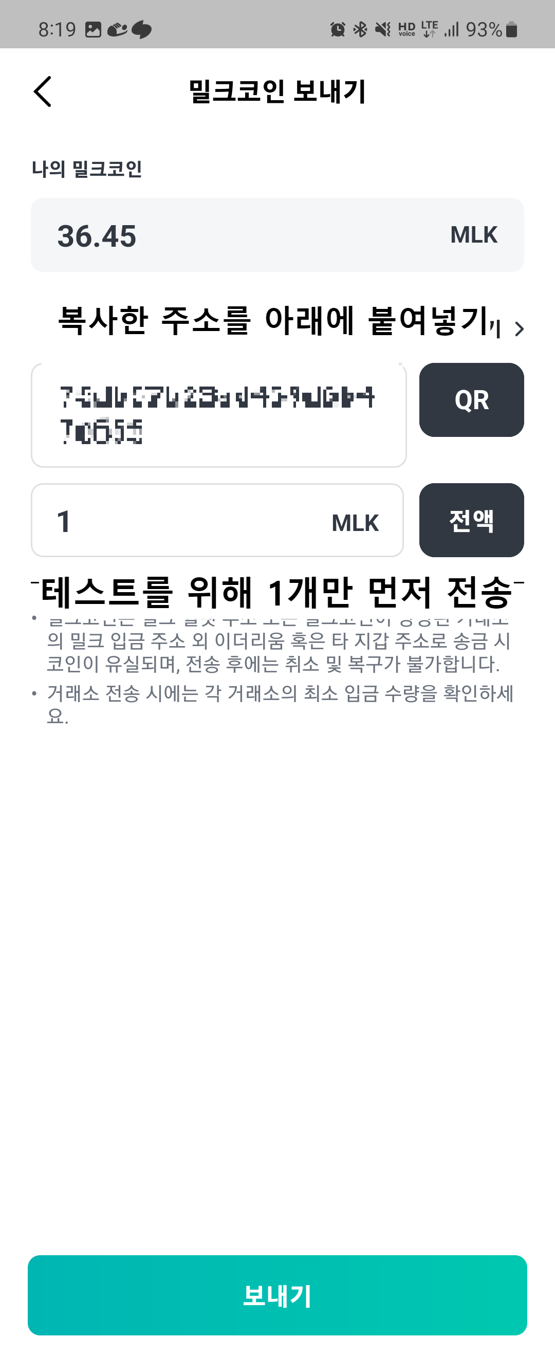 2. 밀크 코인 앱에서 보내기를 누르고 업비트에서 복사한 주소를 붙여넣고 테스트를 위해 1개만 미리 전송해봅니다.